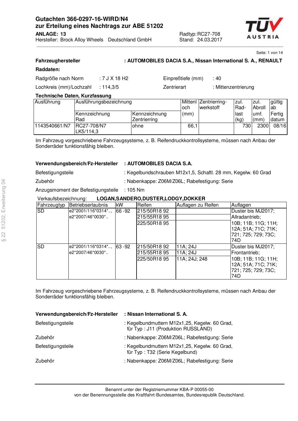 Dieses Gutachten (abe) bezieht sich auf die Alufelge Brock RC27-708 in der Ausführung 7Jx18 ET 0, Mittenloch 0 mm (KBA 51202). Im PDF findest du typischerweise zulässige Reifengrößen, Auflagen/Anbauhinweise und – je nach Dokument – Hinweise zur Eintragung.