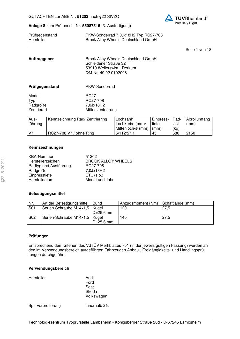 Dieses Gutachten (abe) bezieht sich auf die Alufelge Brock RC27-708 in der Ausführung 7Jx18 ET 0, Mittenloch 0 mm (KBA 51202). Im PDF findest du typischerweise zulässige Reifengrößen, Auflagen/Anbauhinweise und – je nach Dokument – Hinweise zur Eintragung.