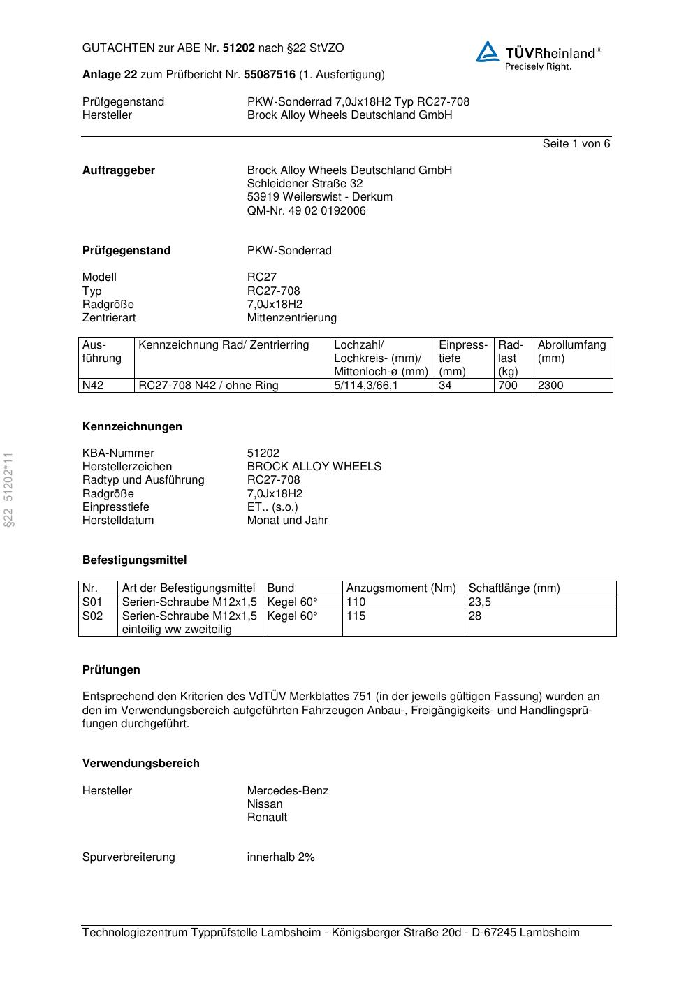 Dieses Gutachten (abe) bezieht sich auf die Alufelge Brock RC27-708 in der Ausführung 7Jx18 ET 0, Mittenloch 0 mm (KBA 51202). Im PDF findest du typischerweise zulässige Reifengrößen, Auflagen/Anbauhinweise und – je nach Dokument – Hinweise zur Eintragung.