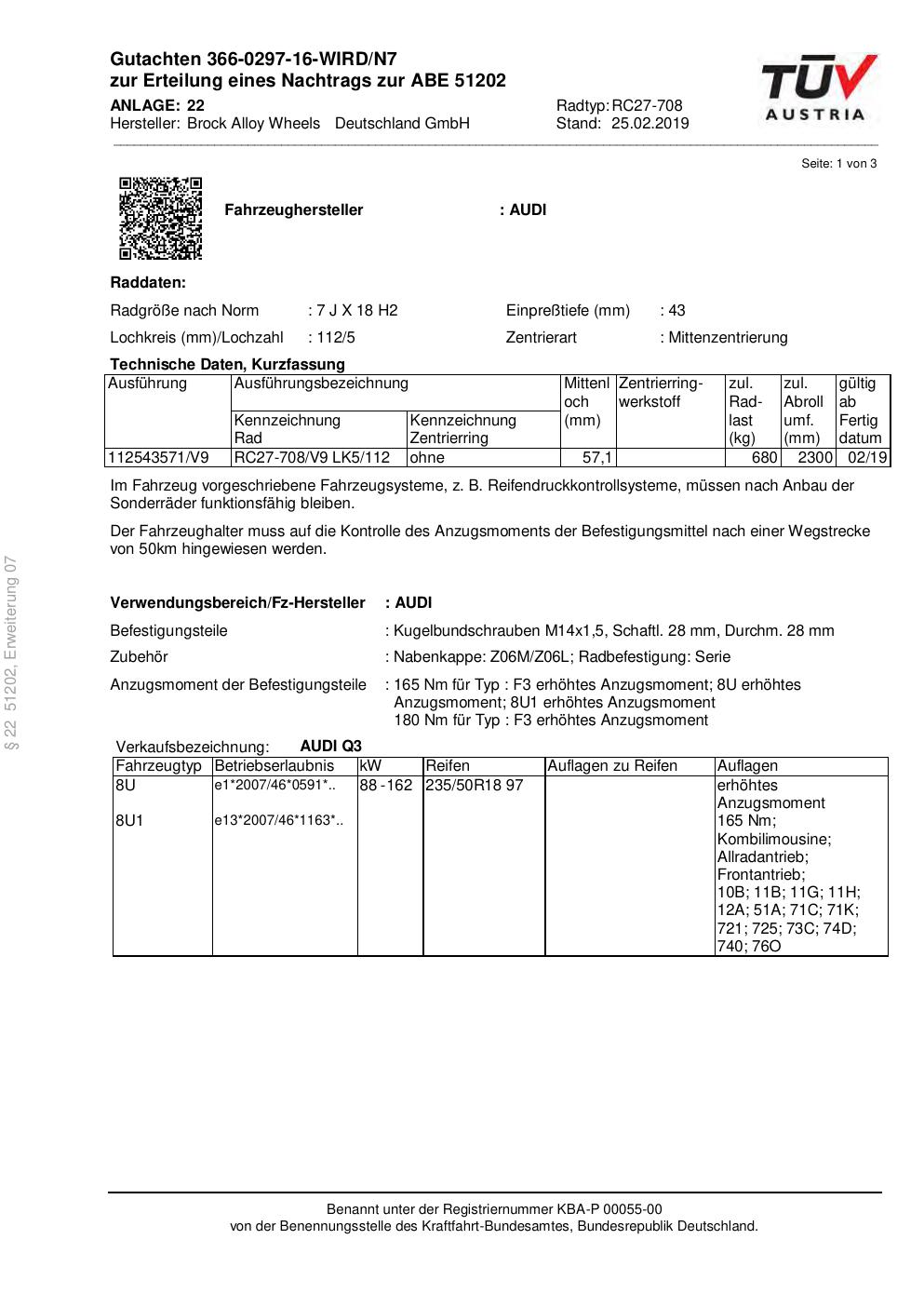 Dieses Gutachten (abe) bezieht sich auf die Alufelge Brock RC27-708 in der Ausführung 7Jx18 ET 0, Mittenloch 0 mm (KBA 51202). Im PDF findest du typischerweise zulässige Reifengrößen, Auflagen/Anbauhinweise und – je nach Dokument – Hinweise zur Eintragung.