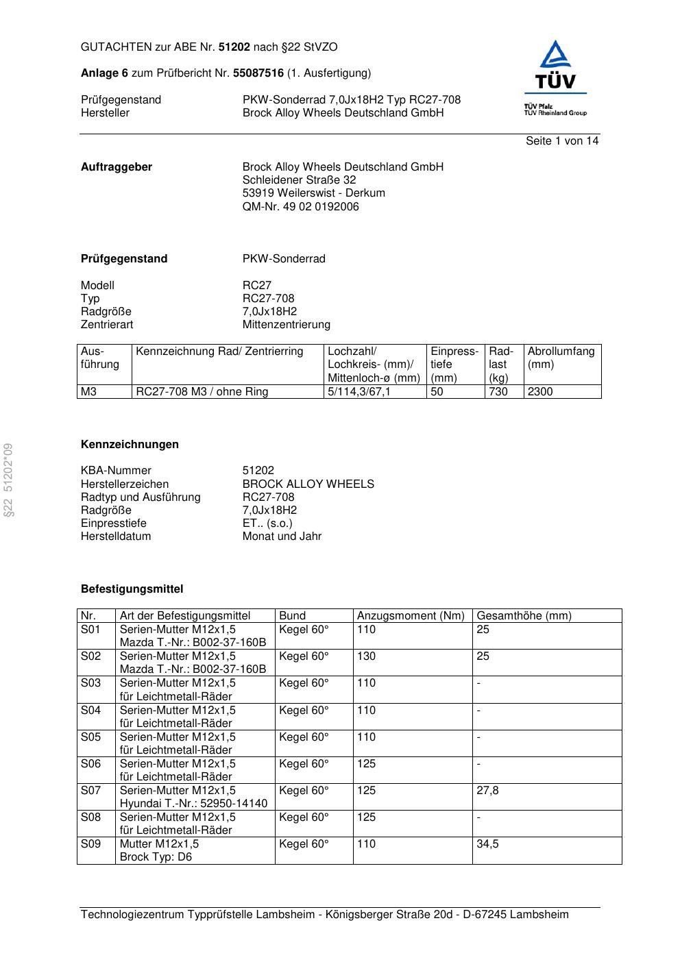 Dieses Gutachten (abe) bezieht sich auf die Alufelge Brock RC27-708 in der Ausführung 7Jx18 ET 0, Mittenloch 0 mm (KBA 51202). Im PDF findest du typischerweise zulässige Reifengrößen, Auflagen/Anbauhinweise und – je nach Dokument – Hinweise zur Eintragung.