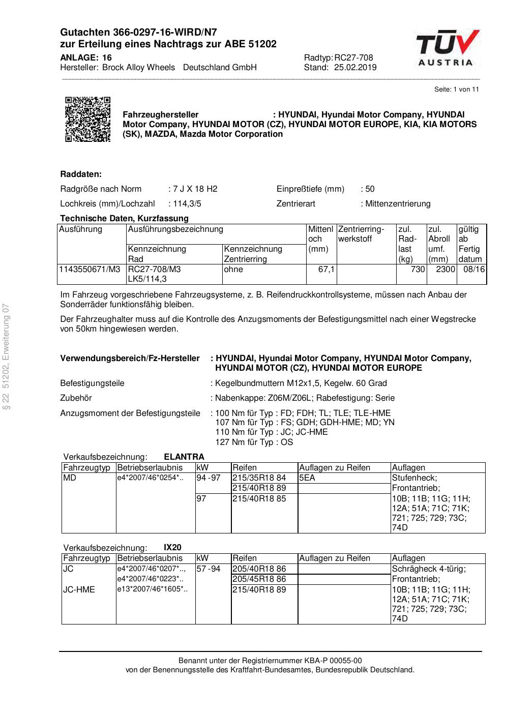 Dieses Gutachten (abe) bezieht sich auf die Alufelge Brock RC27-708 in der Ausführung 7Jx18 ET 0, Mittenloch 0 mm (KBA 51202). Im PDF findest du typischerweise zulässige Reifengrößen, Auflagen/Anbauhinweise und – je nach Dokument – Hinweise zur Eintragung.