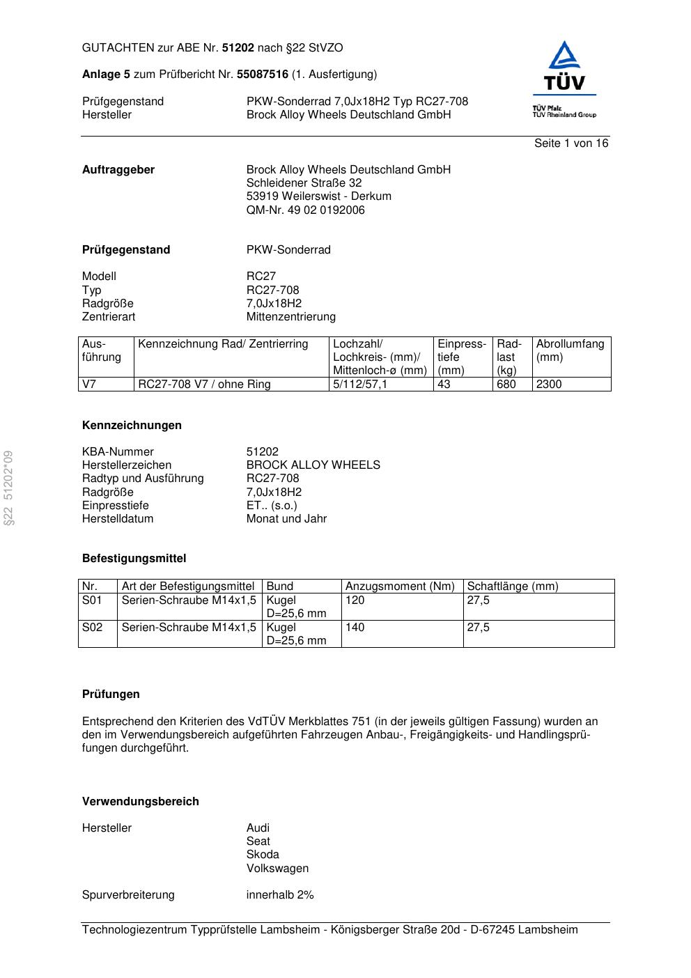 Felgengutachten / abe für Alufelgen Brock RC27-708 (7Jx18 ET 0, Mittenloch 0 mm) mit KBA 51202 (Zertifikatsnummer 51202). Hier kostenlos als PDF herunterladen. Der Download-Link ist 24 Stunden gültig und kann bis zu zwei Mal verwendet werden.