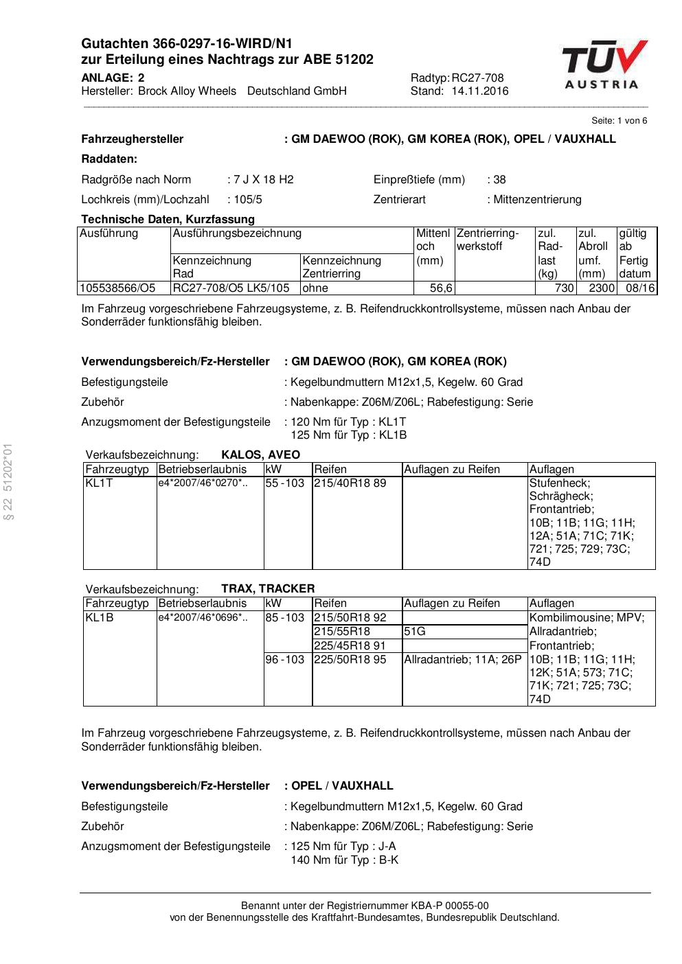 Dieses Gutachten (abe) bezieht sich auf die Alufelge Brock RC27-708 in der Ausführung 7Jx18 ET 0, Mittenloch 0 mm (KBA 51202). Im PDF findest du typischerweise zulässige Reifengrößen, Auflagen/Anbauhinweise und – je nach Dokument – Hinweise zur Eintragung.