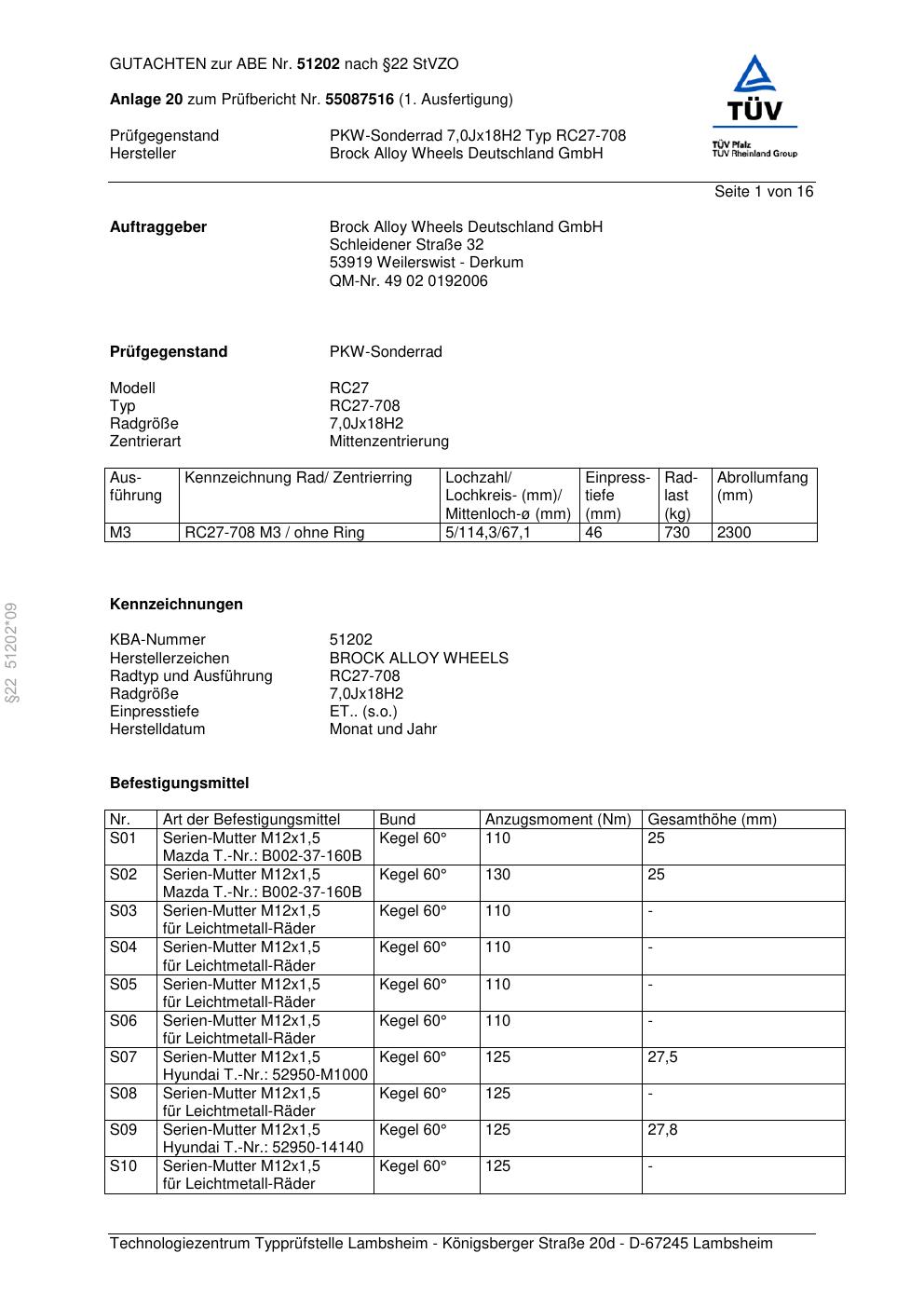 Dieses Gutachten (abe) bezieht sich auf die Alufelge Brock RC27-708 in der Ausführung 7Jx18 ET 0, Mittenloch 0 mm (KBA 51202). Im PDF findest du typischerweise zulässige Reifengrößen, Auflagen/Anbauhinweise und – je nach Dokument – Hinweise zur Eintragung.