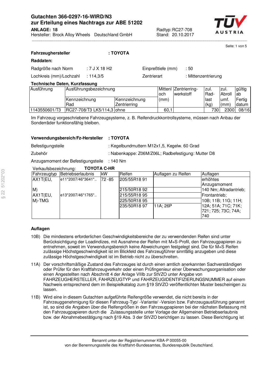 Dieses Gutachten (abe) bezieht sich auf die Alufelge Brock RC27-708 in der Ausführung 7Jx18 ET 0, Mittenloch 0 mm (KBA 51202). Im PDF findest du typischerweise zulässige Reifengrößen, Auflagen/Anbauhinweise und – je nach Dokument – Hinweise zur Eintragung.