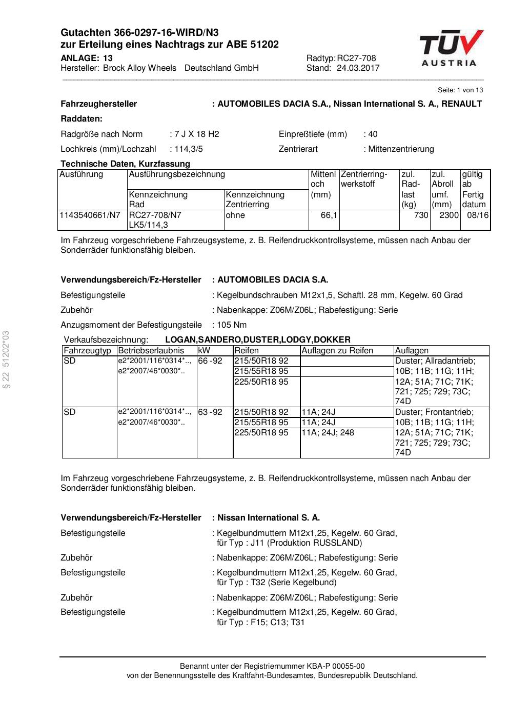 Dieses Gutachten (abe) bezieht sich auf die Alufelge Brock RC27-708 in der Ausführung 7Jx18 ET 0, Mittenloch 0 mm (KBA 51202). Im PDF findest du typischerweise zulässige Reifengrößen, Auflagen/Anbauhinweise und – je nach Dokument – Hinweise zur Eintragung.