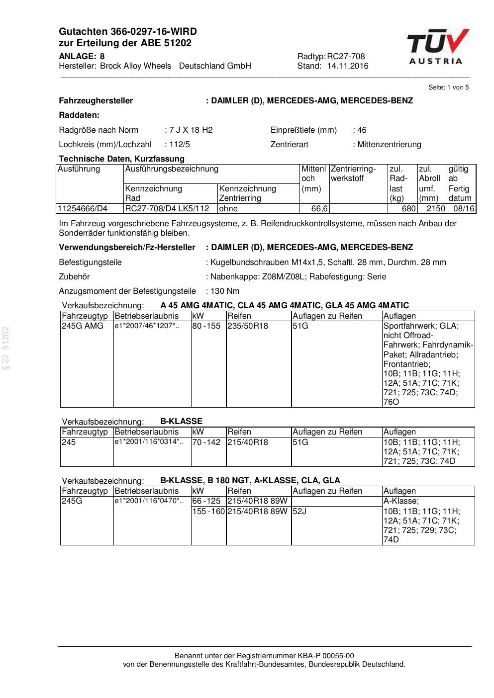 Dieses Gutachten (abe) bezieht sich auf die Alufelge Brock RC27-708 in der Ausführung 7Jx18 ET 0, Mittenloch 0 mm (KBA 51202). Im PDF findest du typischerweise zulässige Reifengrößen, Auflagen/Anbauhinweise und – je nach Dokument – Hinweise zur Eintragung.