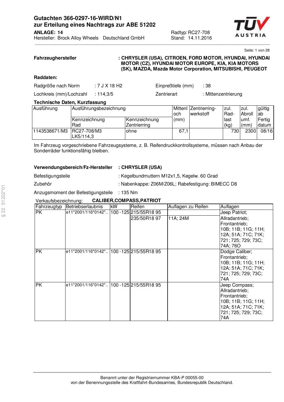 Dieses Gutachten (abe) bezieht sich auf die Alufelge Brock RC27-708 in der Ausführung 7Jx18 ET 0, Mittenloch 0 mm (KBA 51202). Im PDF findest du typischerweise zulässige Reifengrößen, Auflagen/Anbauhinweise und – je nach Dokument – Hinweise zur Eintragung.