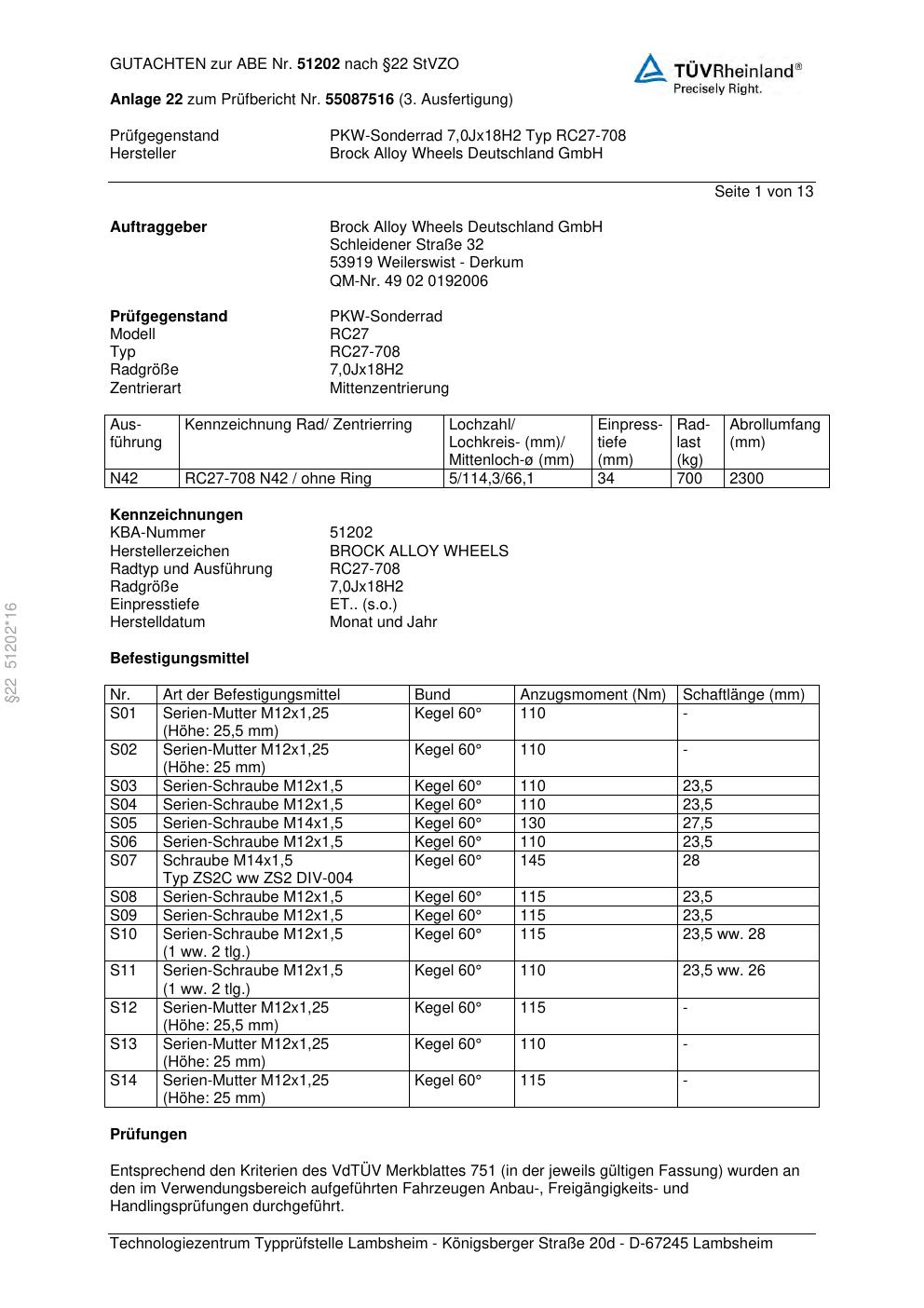 Dieses Gutachten (abe) bezieht sich auf die Alufelge Brock RC27-708 in der Ausführung 7Jx18 ET 0, Mittenloch 0 mm (KBA 51202). Im PDF findest du typischerweise zulässige Reifengrößen, Auflagen/Anbauhinweise und – je nach Dokument – Hinweise zur Eintragung.