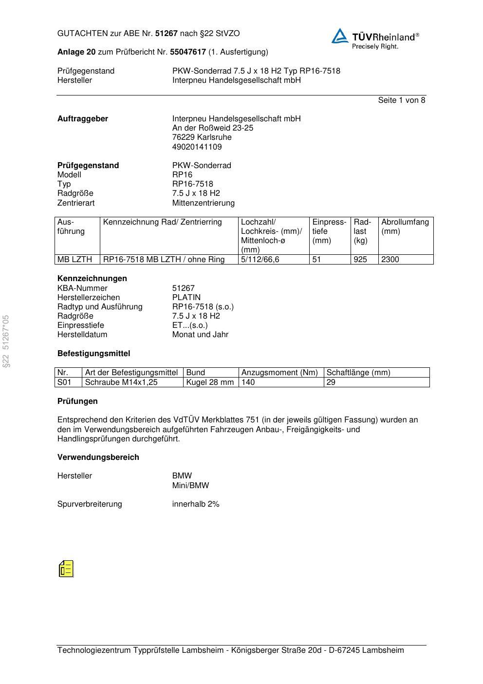 • Stimmt die KBA-Nummer auf der Felge mit diesem Dokument überein?