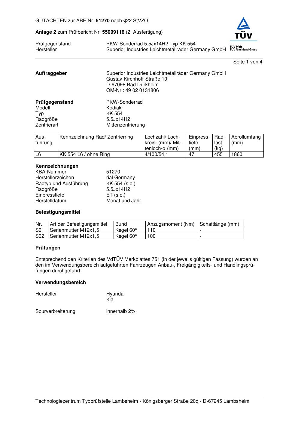 Dieses Gutachten (abe) bezieht sich auf die Alufelge brand-rial KK 554 in der Ausführung 5.5Jx14 ET 0, Mittenloch 0 mm (KBA 51270). Im PDF findest du typischerweise zulässige Reifengrößen, Auflagen/Anbauhinweise und – je nach Dokument – Hinweise zur Eintragung.