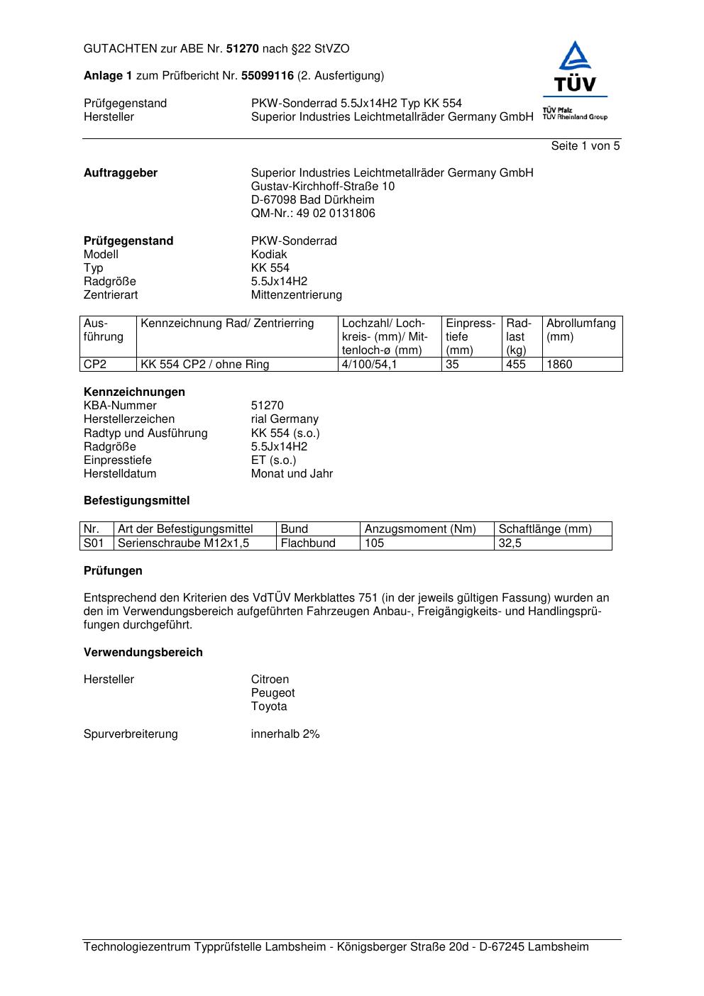 Dieses Gutachten (abe) bezieht sich auf die Alufelge brand-rial KK 554 in der Ausführung 5.5Jx14 ET 0, Mittenloch 0 mm (KBA 51270). Im PDF findest du typischerweise zulässige Reifengrößen, Auflagen/Anbauhinweise und – je nach Dokument – Hinweise zur Eintragung.