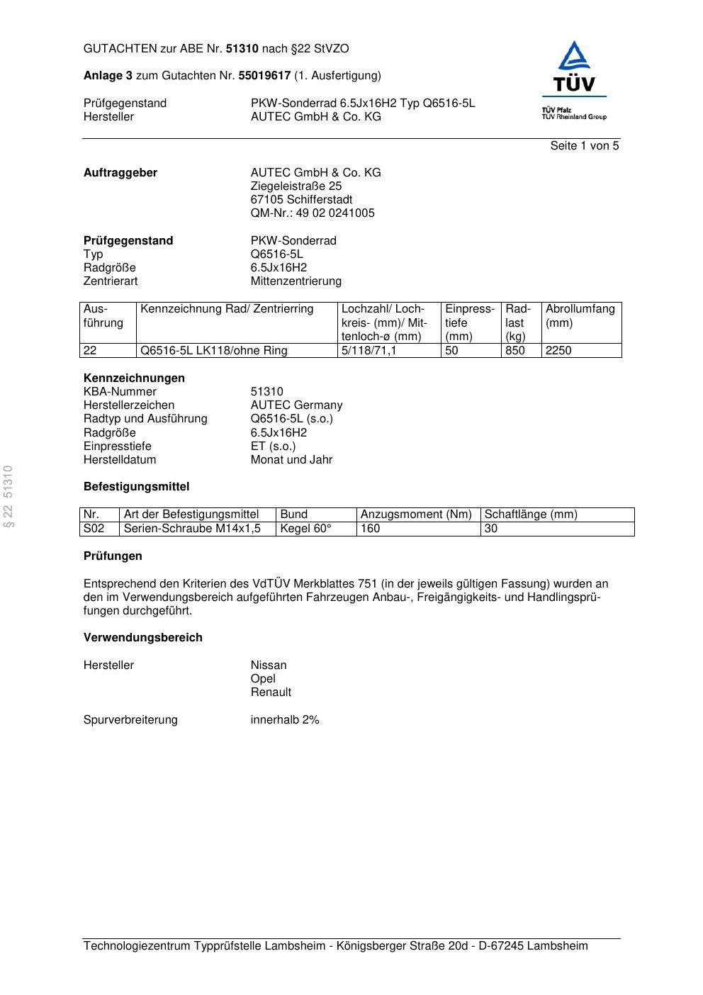 Dieses Gutachten (abe) bezieht sich auf die Alufelge Autec Q6516 in der Ausführung 6.5Jx16 ET 0, Mittenloch 0 mm (KBA 51310). Im PDF findest du typischerweise zulässige Reifengrößen, Auflagen/Anbauhinweise und – je nach Dokument – Hinweise zur Eintragung.