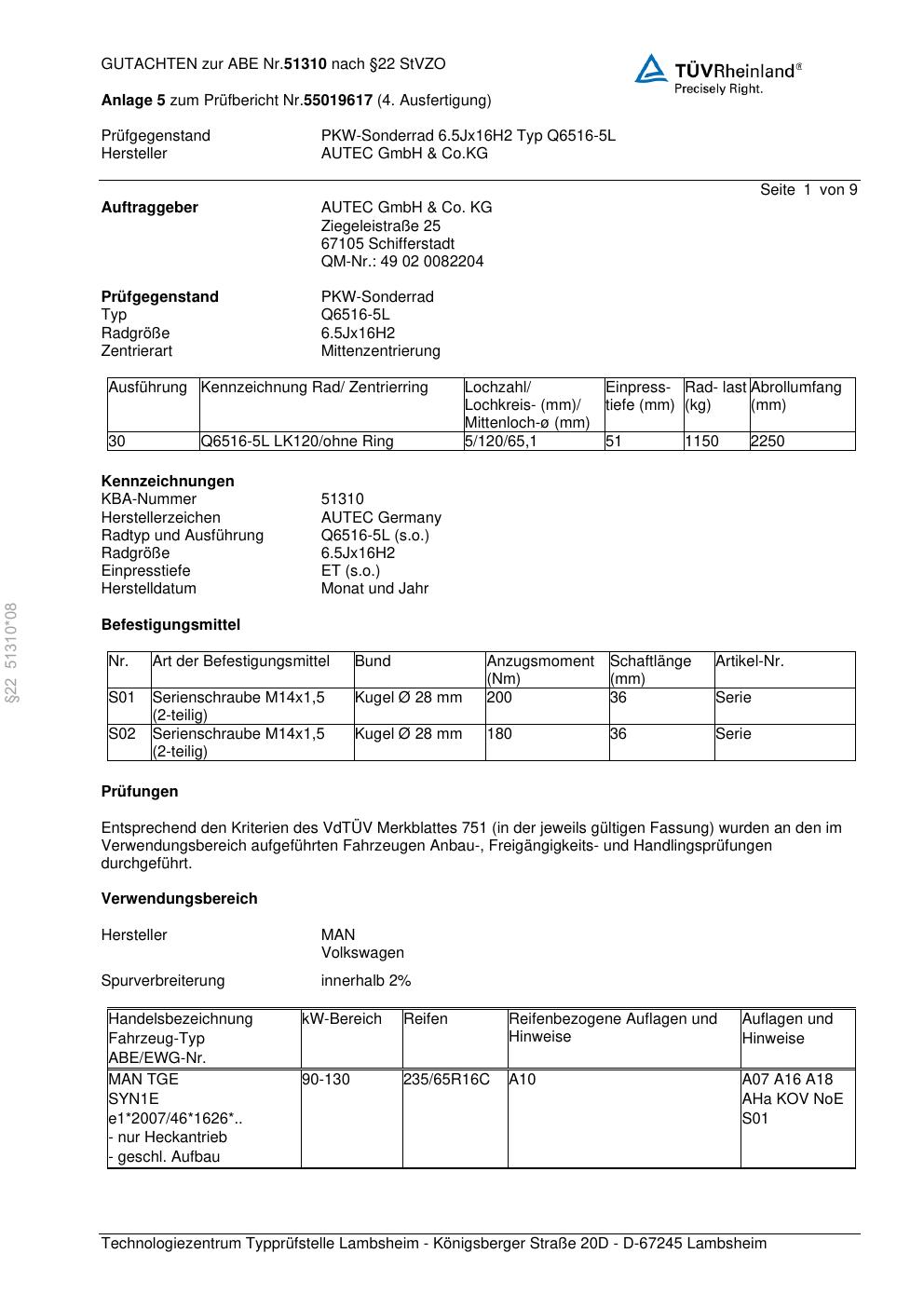 Dieses Gutachten (abe) bezieht sich auf die Alufelge Autec Q6516 in der Ausführung 6.5Jx16 ET 0, Mittenloch 0 mm (KBA 51310). Im PDF findest du typischerweise zulässige Reifengrößen, Auflagen/Anbauhinweise und – je nach Dokument – Hinweise zur Eintragung.