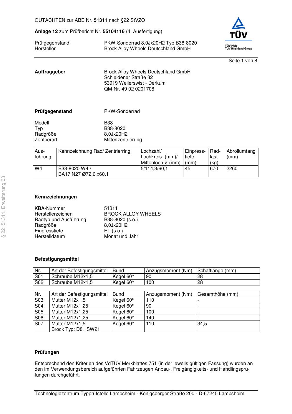 Dieses Gutachten (abe) bezieht sich auf die Alufelge Brock B38-8020 in der Ausführung 8Jx2 ET 0, Mittenloch 0 mm (KBA 51311). Im PDF findest du typischerweise zulässige Reifengrößen, Auflagen/Anbauhinweise und – je nach Dokument – Hinweise zur Eintragung.