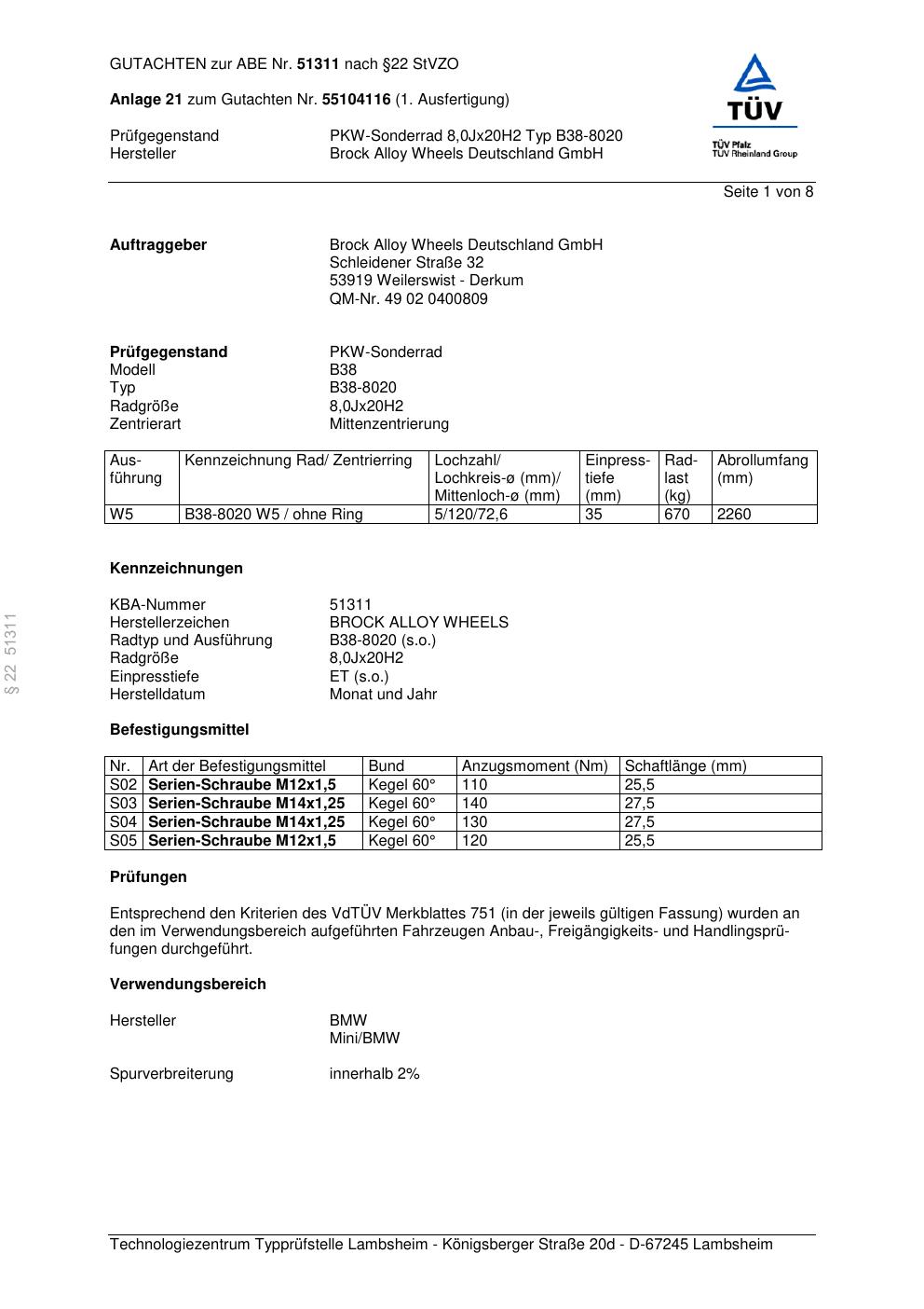 Felgengutachten / abe für Alufelgen Brock B38-8020 (8Jx2 ET 0, Mittenloch 0 mm) mit KBA 51311 (Zertifikatsnummer 51311). Hier kostenlos als PDF herunterladen. Der Download-Link ist 24 Stunden gültig und kann bis zu zwei Mal verwendet werden.