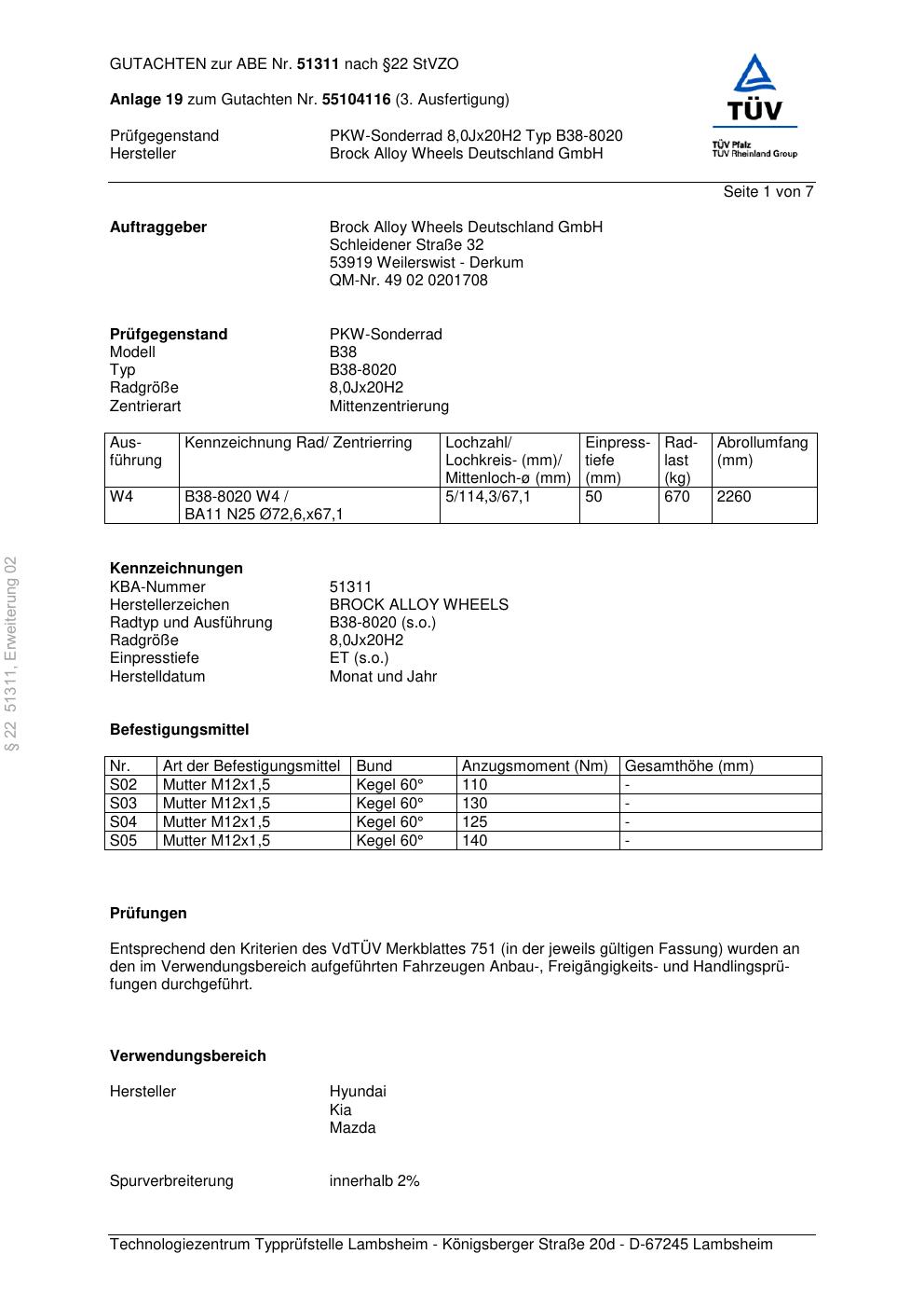 Dieses Gutachten (abe) bezieht sich auf die Alufelge Brock B38-8020 in der Ausführung 8Jx2 ET 0, Mittenloch 0 mm (KBA 51311). Im PDF findest du typischerweise zulässige Reifengrößen, Auflagen/Anbauhinweise und – je nach Dokument – Hinweise zur Eintragung.