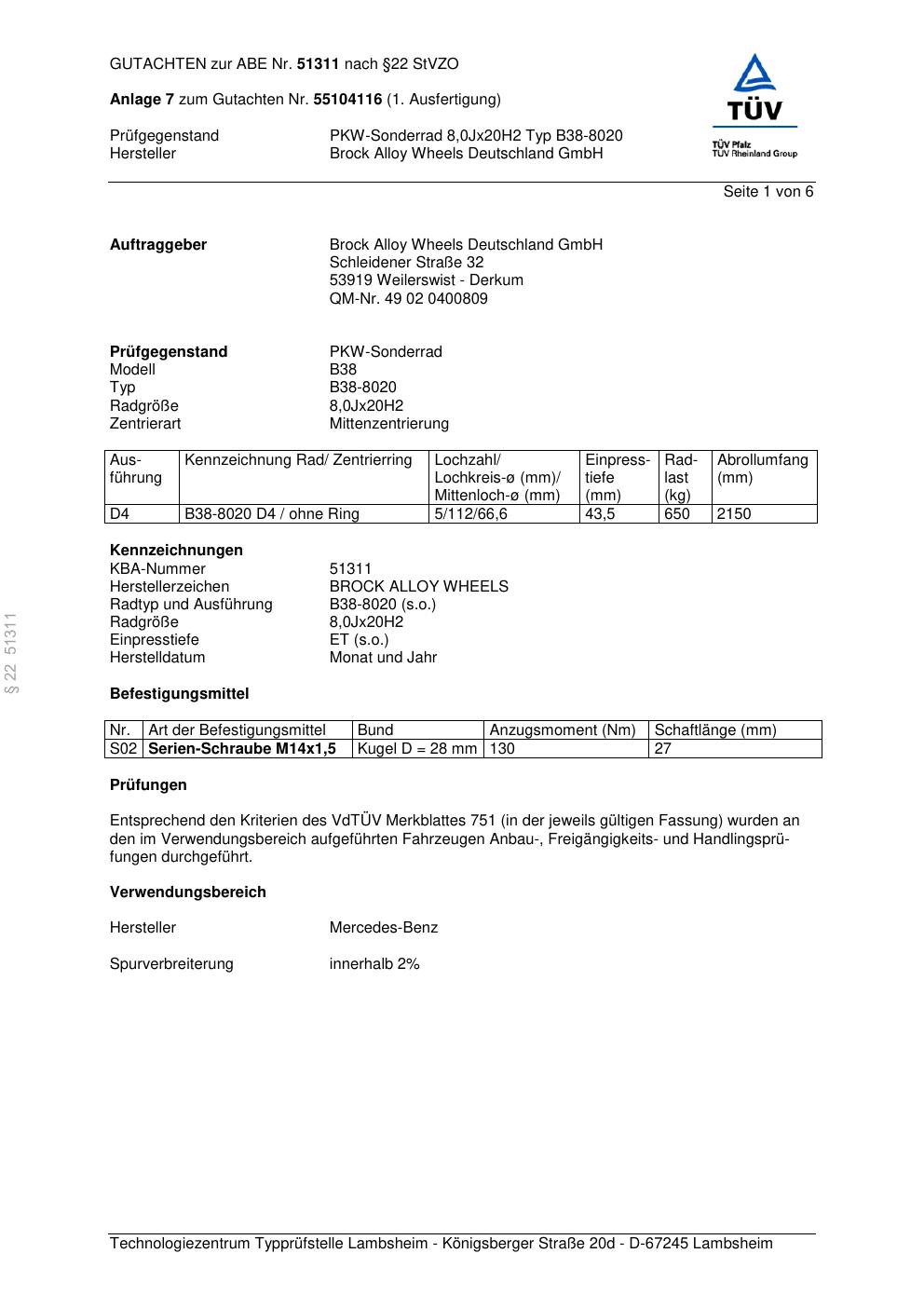 Dieses Gutachten (abe) bezieht sich auf die Alufelge Brock B38-8020 in der Ausführung 8Jx2 ET 0, Mittenloch 0 mm (KBA 51311). Im PDF findest du typischerweise zulässige Reifengrößen, Auflagen/Anbauhinweise und – je nach Dokument – Hinweise zur Eintragung.