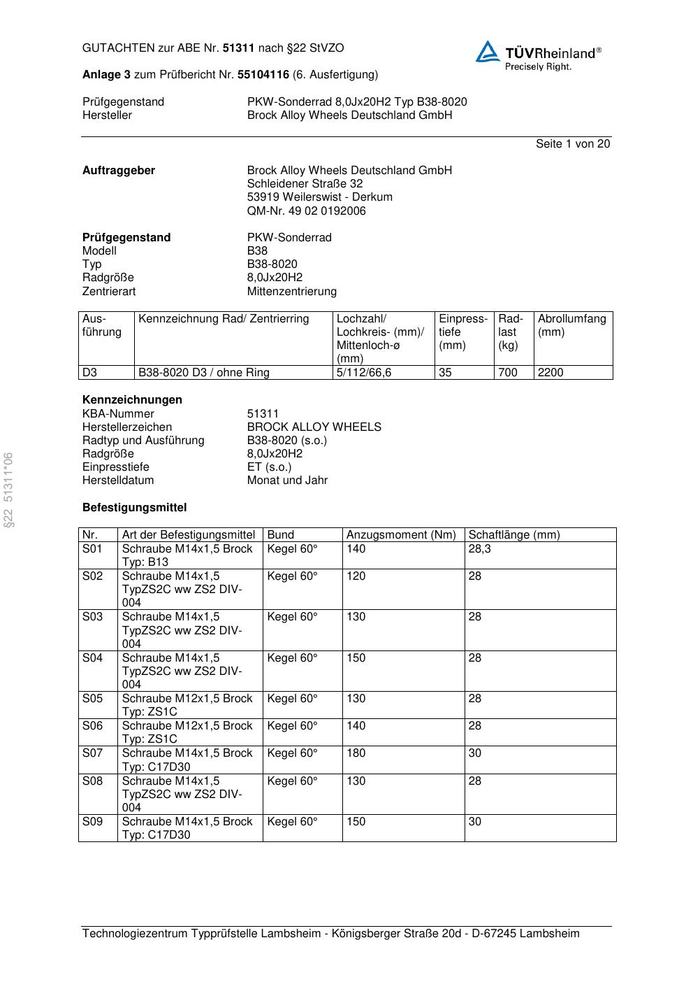 Felgengutachten / abe für Alufelgen Brock B38-8020 (8Jx2 ET 0, Mittenloch 0 mm) mit KBA 51311 (Zertifikatsnummer 51311). Hier kostenlos als PDF herunterladen. Der Download-Link ist 24 Stunden gültig und kann bis zu zwei Mal verwendet werden.
