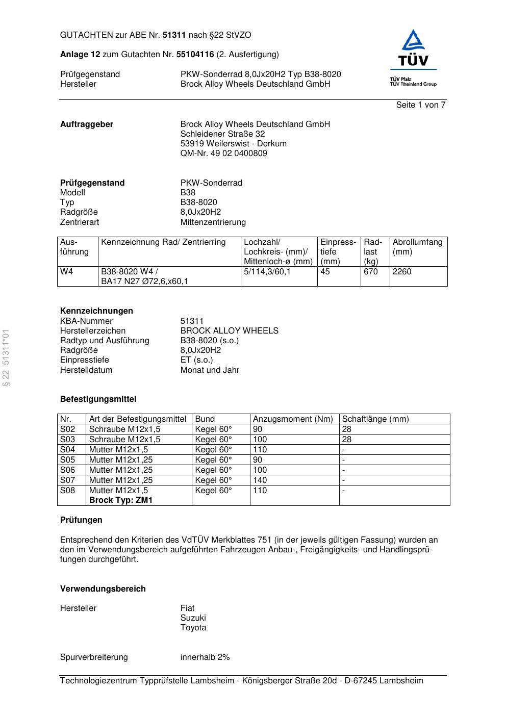 Dieses Gutachten (abe) bezieht sich auf die Alufelge Brock B38-8020 in der Ausführung 8Jx2 ET 0, Mittenloch 0 mm (KBA 51311). Im PDF findest du typischerweise zulässige Reifengrößen, Auflagen/Anbauhinweise und – je nach Dokument – Hinweise zur Eintragung.