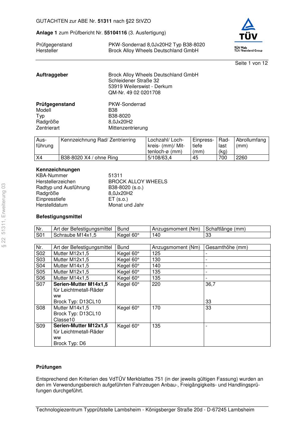 Felgengutachten / abe für Alufelgen Brock B38-8020 (8Jx2 ET 0, Mittenloch 0 mm) mit KBA 51311 (Zertifikatsnummer 51311). Hier kostenlos als PDF herunterladen. Der Download-Link ist 24 Stunden gültig und kann bis zu zwei Mal verwendet werden.