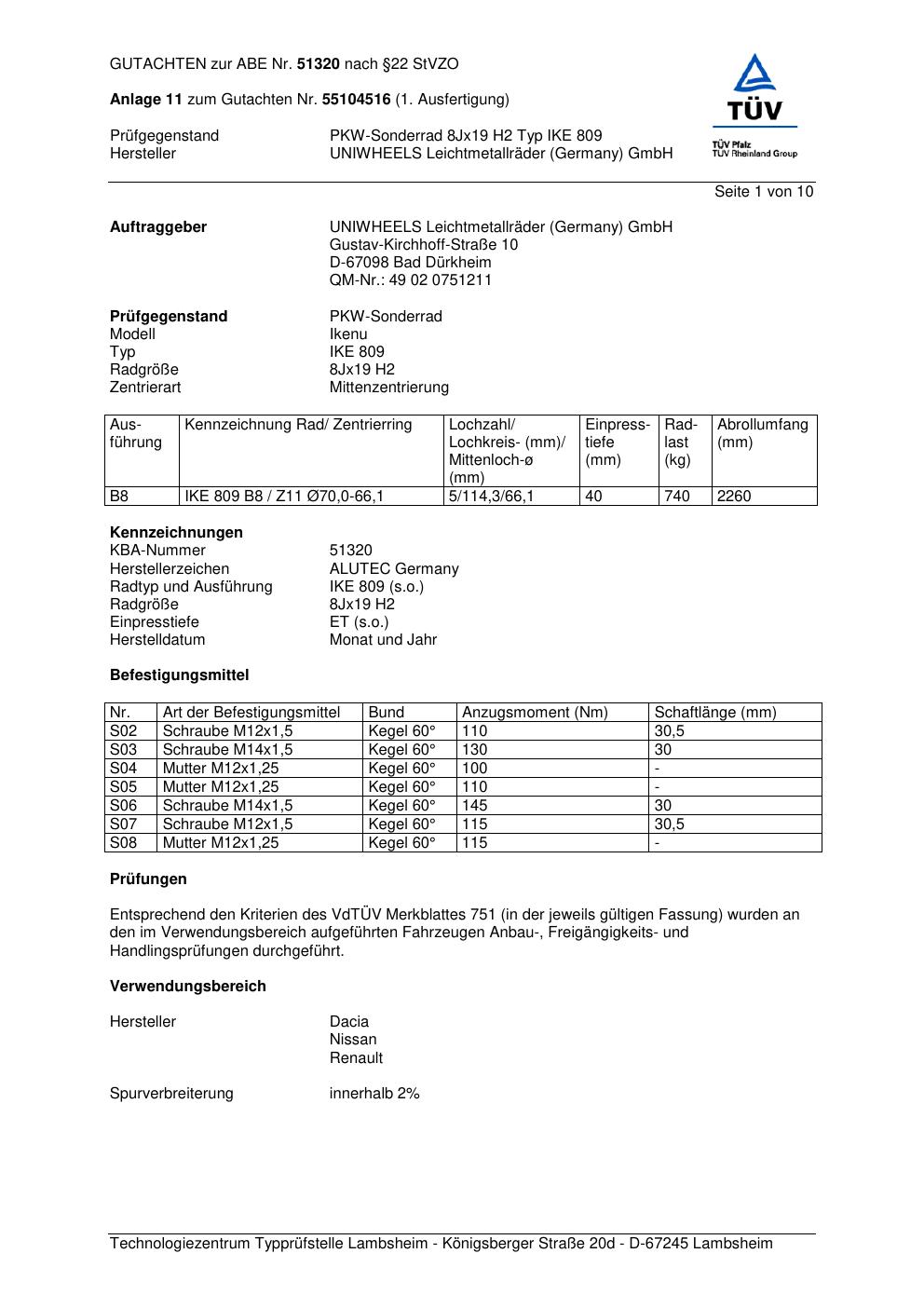 Dieses Gutachten (abe) bezieht sich auf die Alufelge ALUTEC IKE 809 in der Ausführung 8Jx19 ET 0, Mittenloch 0 mm (KBA 51320). Im PDF findest du typischerweise zulässige Reifengrößen, Auflagen/Anbauhinweise und – je nach Dokument – Hinweise zur Eintragung.