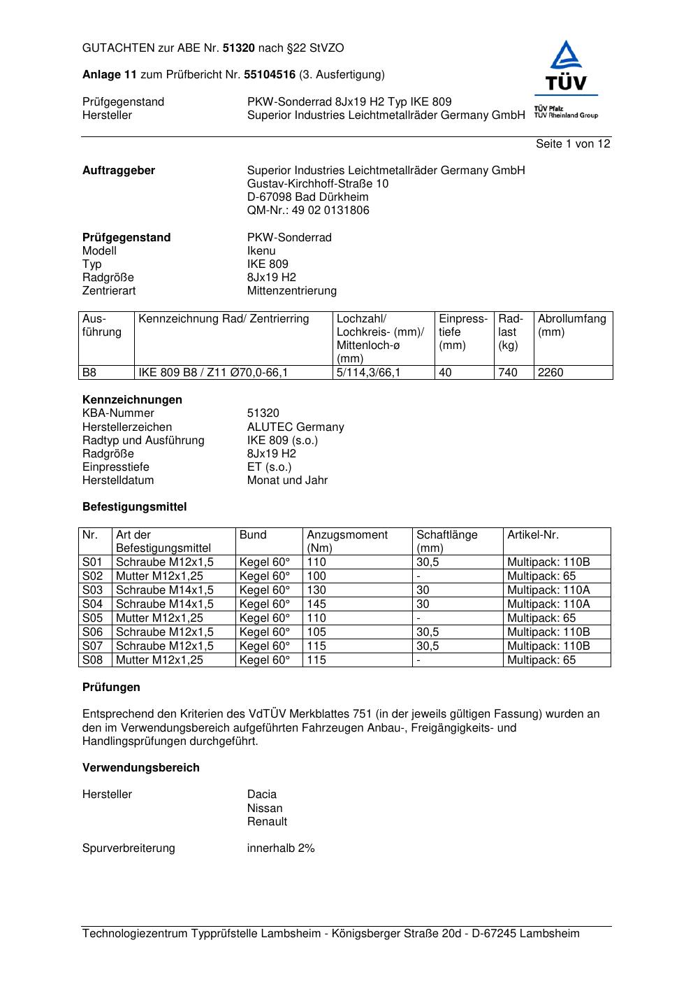 Dieses Gutachten (abe) bezieht sich auf die Alufelge ALUTEC IKE 809 in der Ausführung 8Jx19 ET 0, Mittenloch 0 mm (KBA 51320). Im PDF findest du typischerweise zulässige Reifengrößen, Auflagen/Anbauhinweise und – je nach Dokument – Hinweise zur Eintragung.