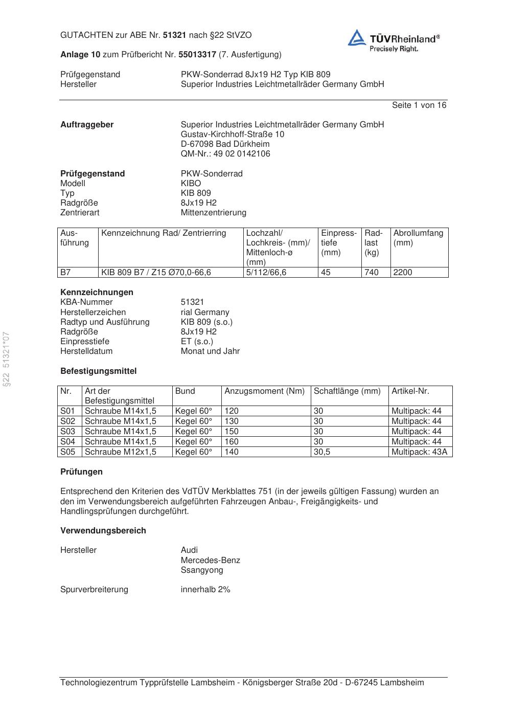 Dieses Gutachten (abe) bezieht sich auf die Alufelge brand-rial KIB 809 in der Ausführung 8Jx19 ET 0, Mittenloch 0 mm (KBA 51321). Im PDF findest du typischerweise zulässige Reifengrößen, Auflagen/Anbauhinweise und – je nach Dokument – Hinweise zur Eintragung.