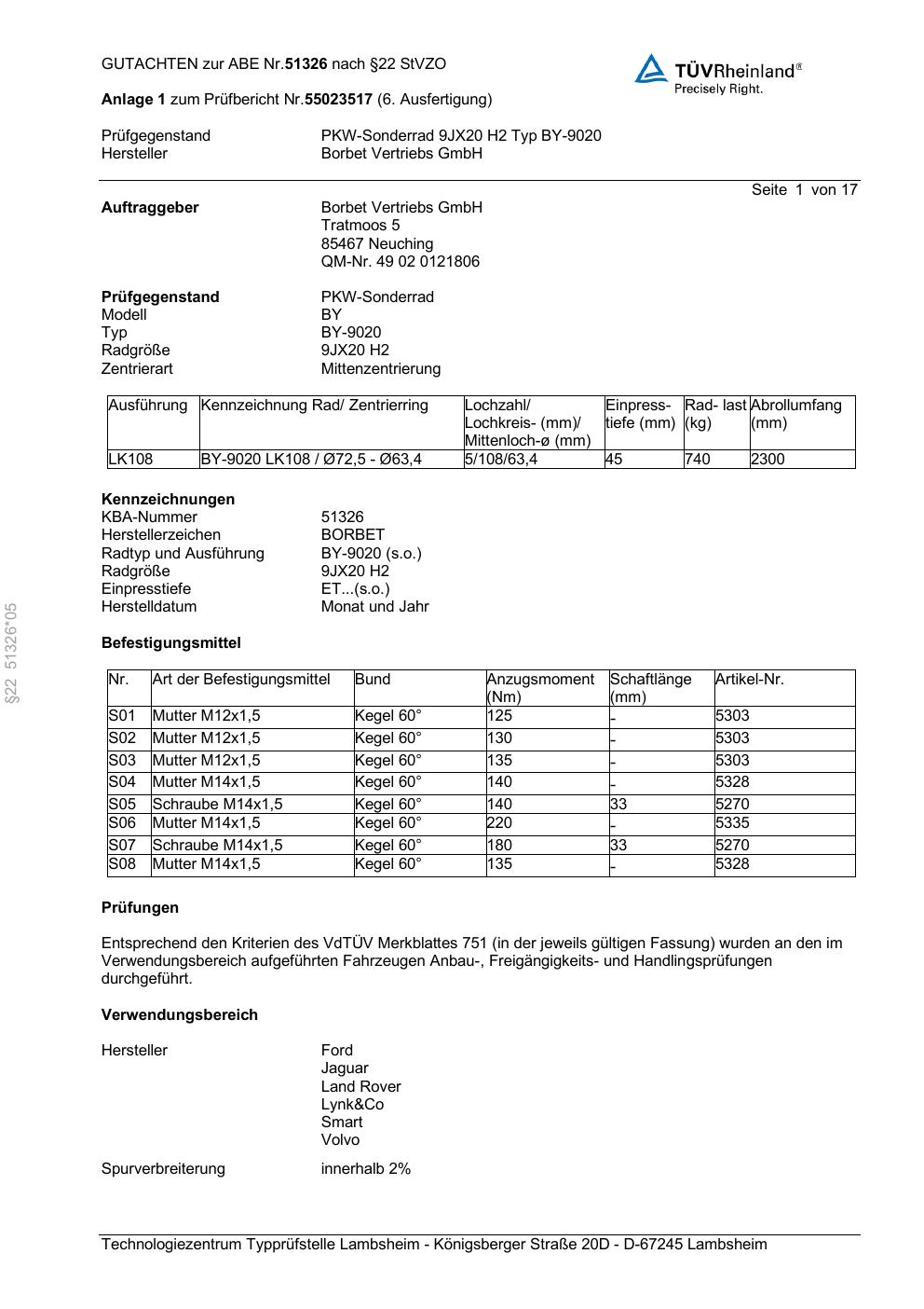 Dieses Gutachten (abe) bezieht sich auf die Alufelge Borbet BY-9020 in der Ausführung 9Jx2 ET 0, Mittenloch 0 mm (KBA 51326). Im PDF findest du typischerweise zulässige Reifengrößen, Auflagen/Anbauhinweise und – je nach Dokument – Hinweise zur Eintragung.