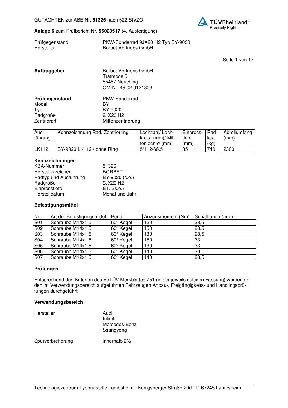 Felgengutachten / abe für Alufelgen Borbet BY-9020 (9Jx2 ET 0, Mittenloch 0 mm) mit KBA 51326 (Zertifikatsnummer 51326). Hier kostenlos als PDF herunterladen. Der Download-Link ist 24 Stunden gültig und kann bis zu zwei Mal verwendet werden.
