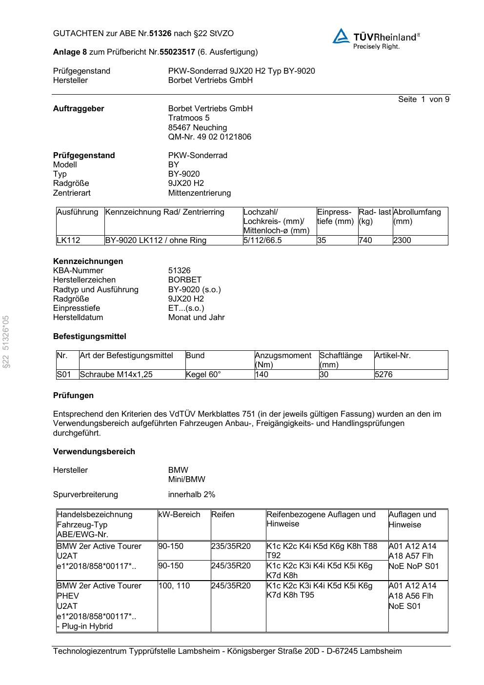 Dieses Gutachten (abe) bezieht sich auf die Alufelge Borbet BY-9020 in der Ausführung 9Jx2 ET 0, Mittenloch 0 mm (KBA 51326). Im PDF findest du typischerweise zulässige Reifengrößen, Auflagen/Anbauhinweise und – je nach Dokument – Hinweise zur Eintragung.