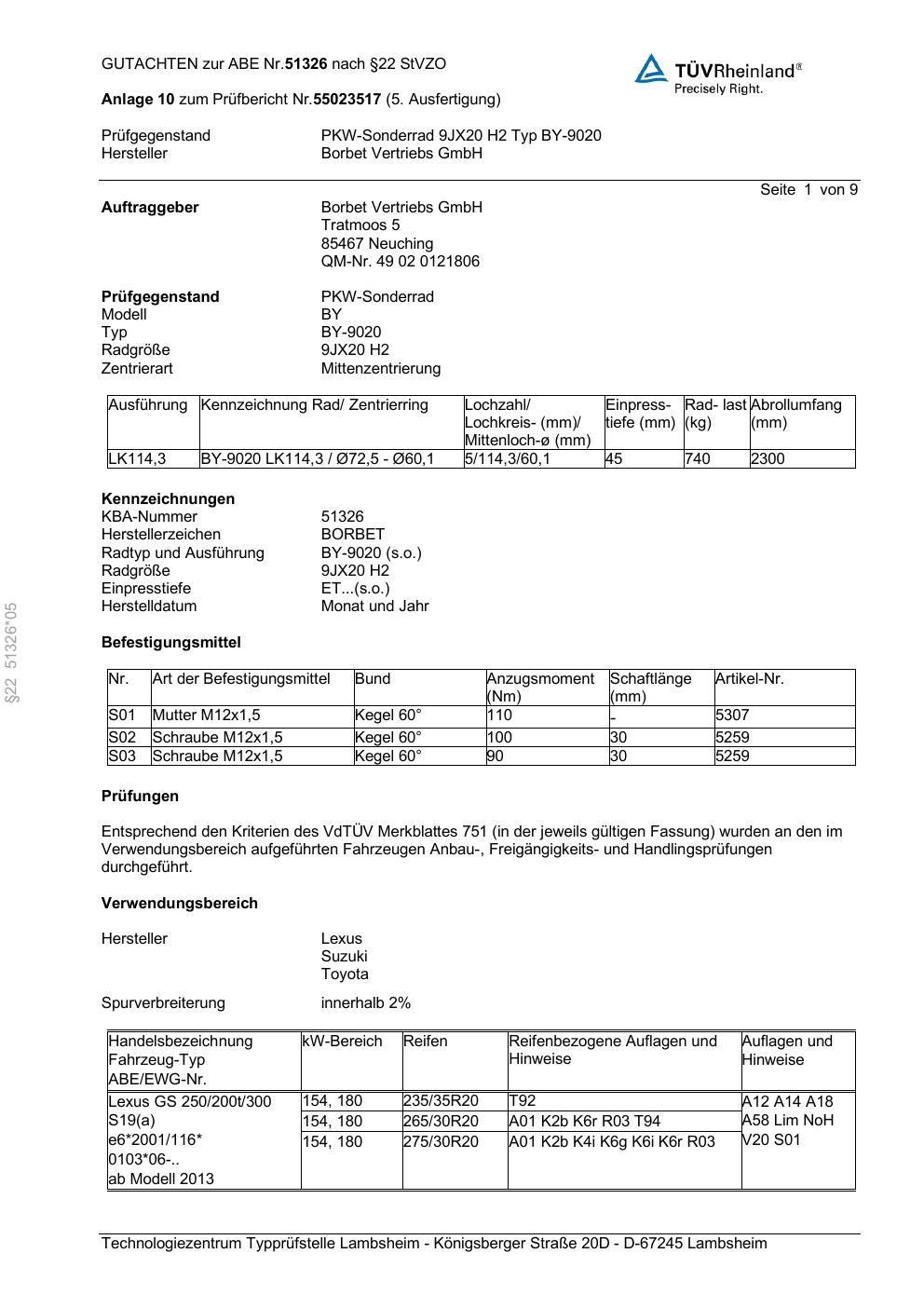 Dieses Gutachten (abe) bezieht sich auf die Alufelge Borbet BY-9020 in der Ausführung 9Jx2 ET 0, Mittenloch 0 mm (KBA 51326). Im PDF findest du typischerweise zulässige Reifengrößen, Auflagen/Anbauhinweise und – je nach Dokument – Hinweise zur Eintragung.