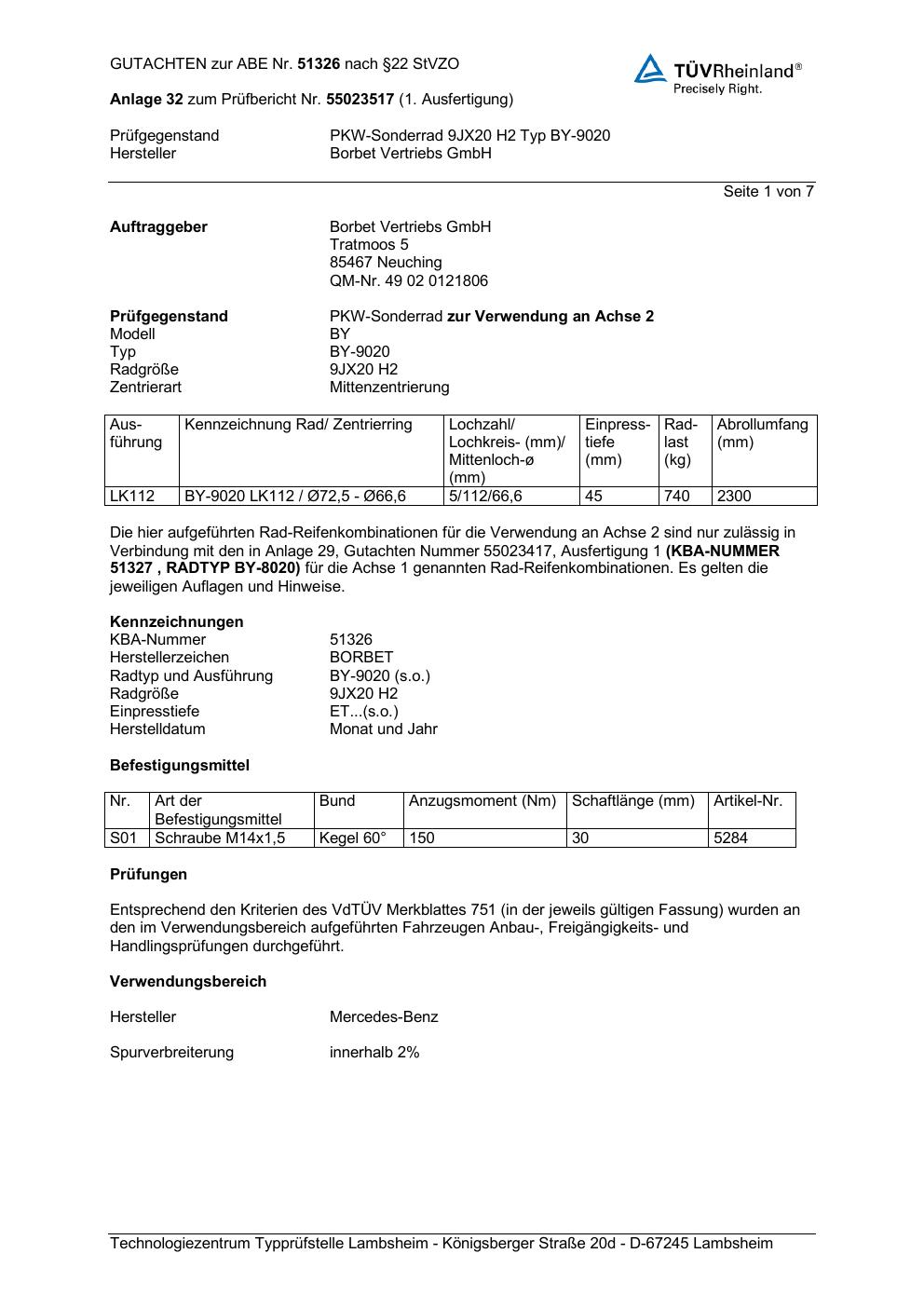 Dieses Gutachten (abe) bezieht sich auf die Alufelge Borbet BY-9020 in der Ausführung 9Jx2 ET 0, Mittenloch 0 mm (KBA 51326). Im PDF findest du typischerweise zulässige Reifengrößen, Auflagen/Anbauhinweise und – je nach Dokument – Hinweise zur Eintragung.