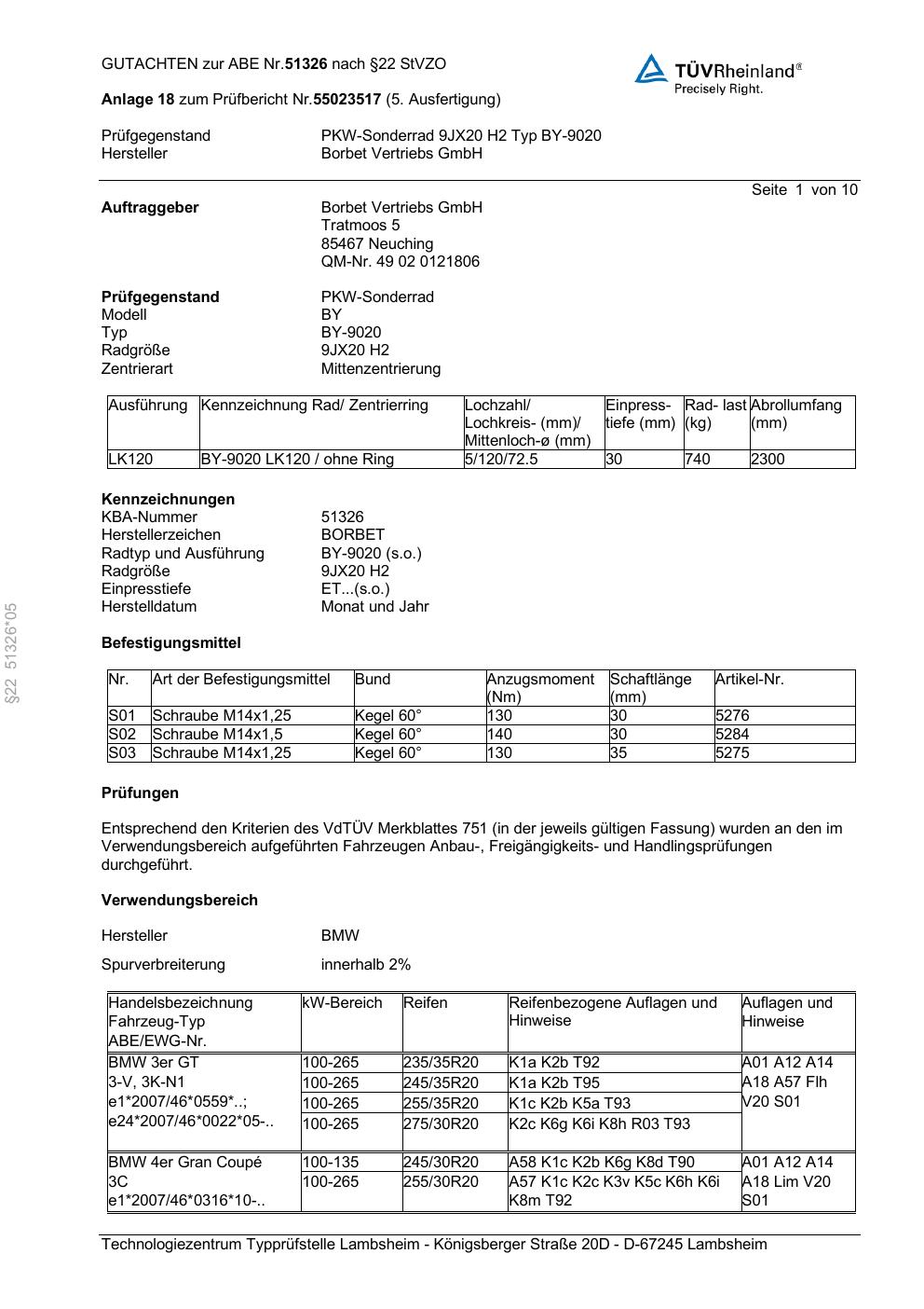 Felgengutachten / abe für Alufelgen Borbet BY-9020 (9Jx2 ET 0, Mittenloch 0 mm) mit KBA 51326 (Zertifikatsnummer 51326). Hier kostenlos als PDF herunterladen. Der Download-Link ist 24 Stunden gültig und kann bis zu zwei Mal verwendet werden.