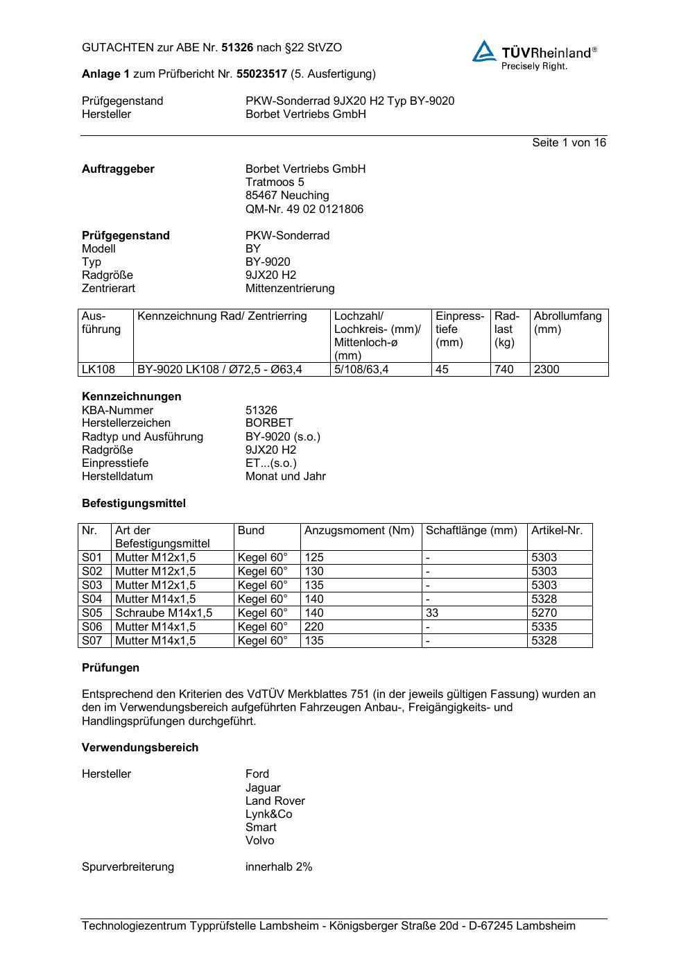Felgengutachten / abe für Alufelgen Borbet BY-9020 (9Jx2 ET 0, Mittenloch 0 mm) mit KBA 51326 (Zertifikatsnummer 51326). Hier kostenlos als PDF herunterladen. Der Download-Link ist 24 Stunden gültig und kann bis zu zwei Mal verwendet werden.
