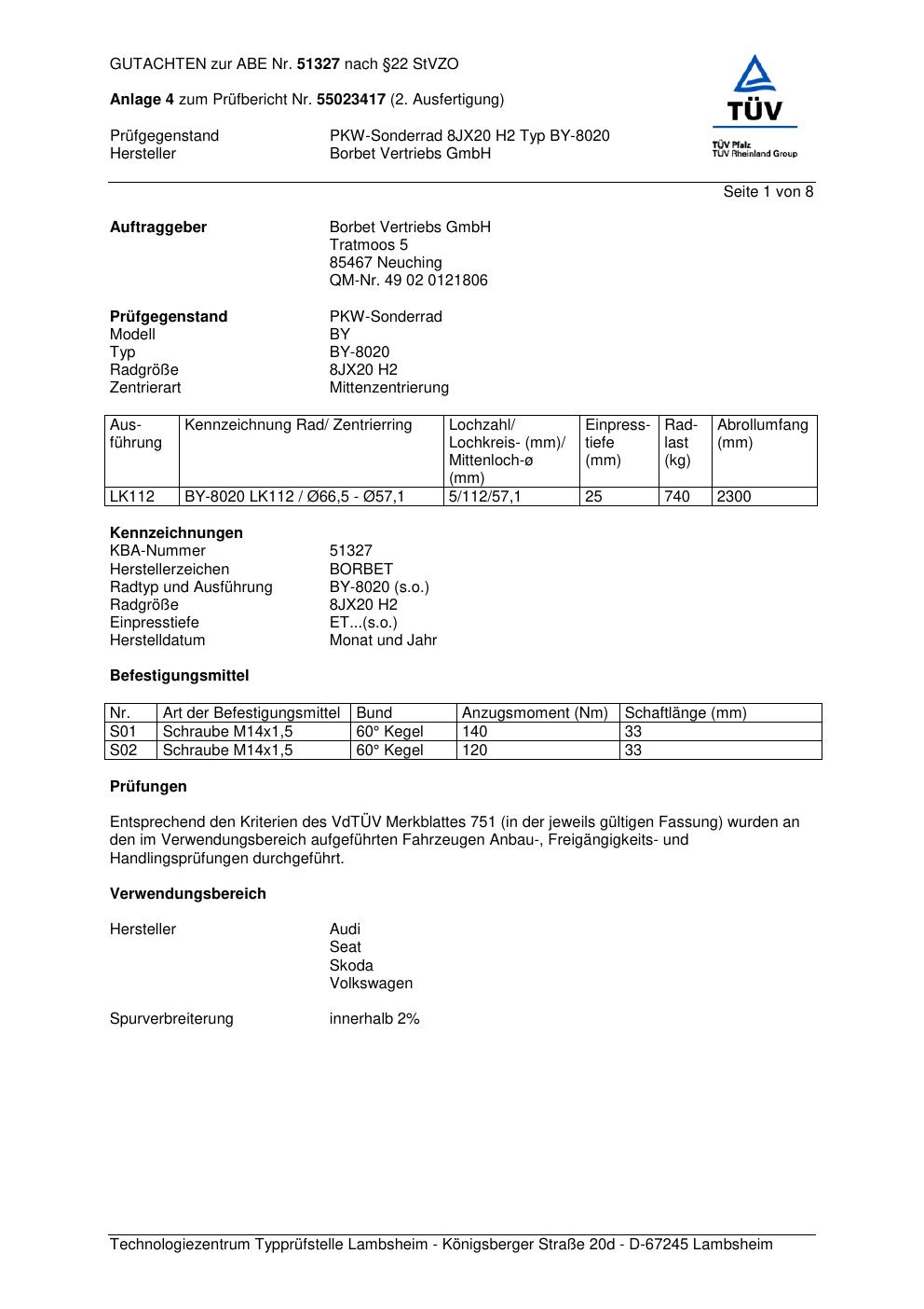Dieses Gutachten (abe) bezieht sich auf die Alufelge Borbet BY-8020 in der Ausführung 8Jx2 ET 0, Mittenloch 0 mm (KBA 51327). Im PDF findest du typischerweise zulässige Reifengrößen, Auflagen/Anbauhinweise und – je nach Dokument – Hinweise zur Eintragung.