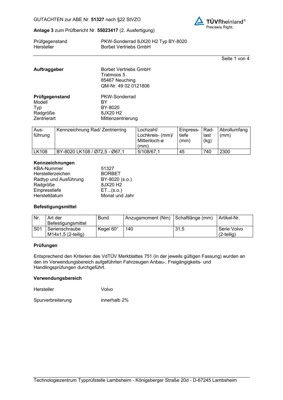 Felgengutachten / abe für Alufelgen Borbet BY-8020 (8Jx2 ET 0, Mittenloch 0 mm) mit KBA 51327 (Zertifikatsnummer 51327). Hier kostenlos als PDF herunterladen. Der Download-Link ist 24 Stunden gültig und kann bis zu zwei Mal verwendet werden.