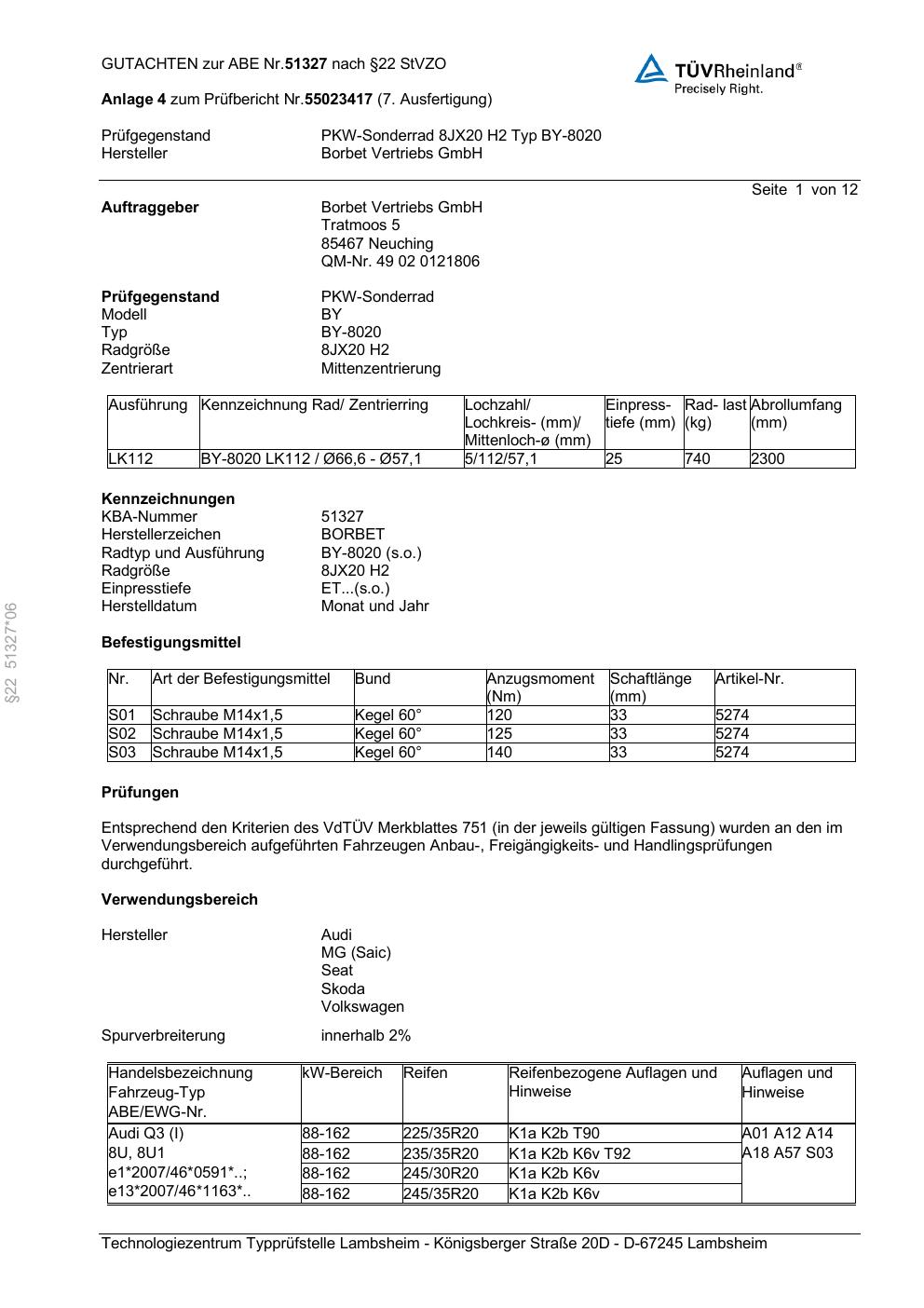 Dieses Gutachten (abe) bezieht sich auf die Alufelge Borbet BY-8020 in der Ausführung 8Jx2 ET 0, Mittenloch 0 mm (KBA 51327). Im PDF findest du typischerweise zulässige Reifengrößen, Auflagen/Anbauhinweise und – je nach Dokument – Hinweise zur Eintragung.