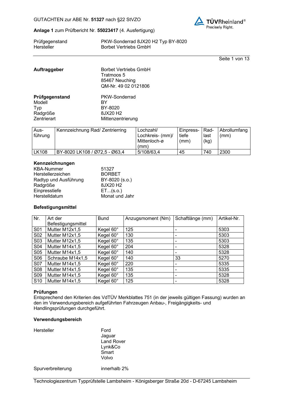 Dieses Gutachten (abe) bezieht sich auf die Alufelge Borbet BY-8020 in der Ausführung 8Jx2 ET 0, Mittenloch 0 mm (KBA 51327). Im PDF findest du typischerweise zulässige Reifengrößen, Auflagen/Anbauhinweise und – je nach Dokument – Hinweise zur Eintragung.