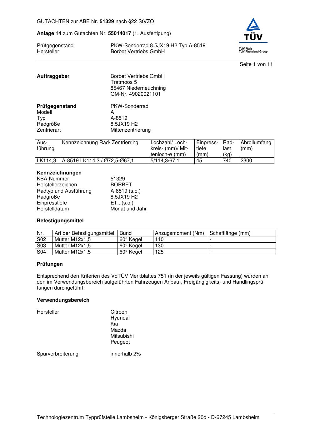 Dieses Gutachten (abe) bezieht sich auf die Alufelge Borbet A-8519 in der Ausführung 8.5Jx19 ET 0, Mittenloch 0 mm (KBA 51329). Im PDF findest du typischerweise zulässige Reifengrößen, Auflagen/Anbauhinweise und – je nach Dokument – Hinweise zur Eintragung.