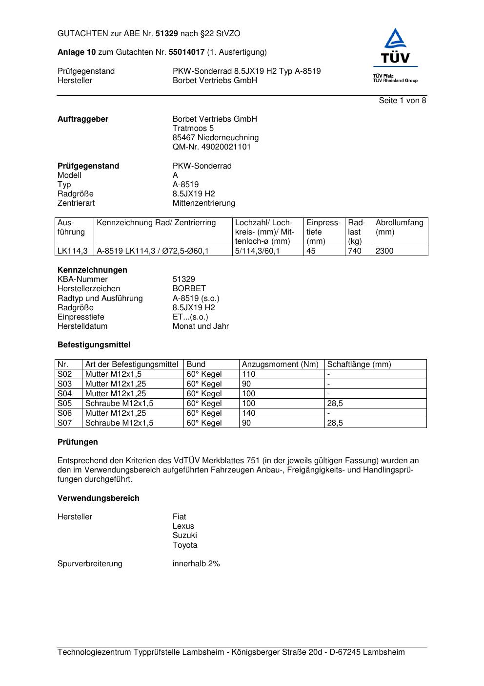 Dieses Gutachten (abe) bezieht sich auf die Alufelge Borbet A-8519 in der Ausführung 8.5Jx19 ET 0, Mittenloch 0 mm (KBA 51329). Im PDF findest du typischerweise zulässige Reifengrößen, Auflagen/Anbauhinweise und – je nach Dokument – Hinweise zur Eintragung.
