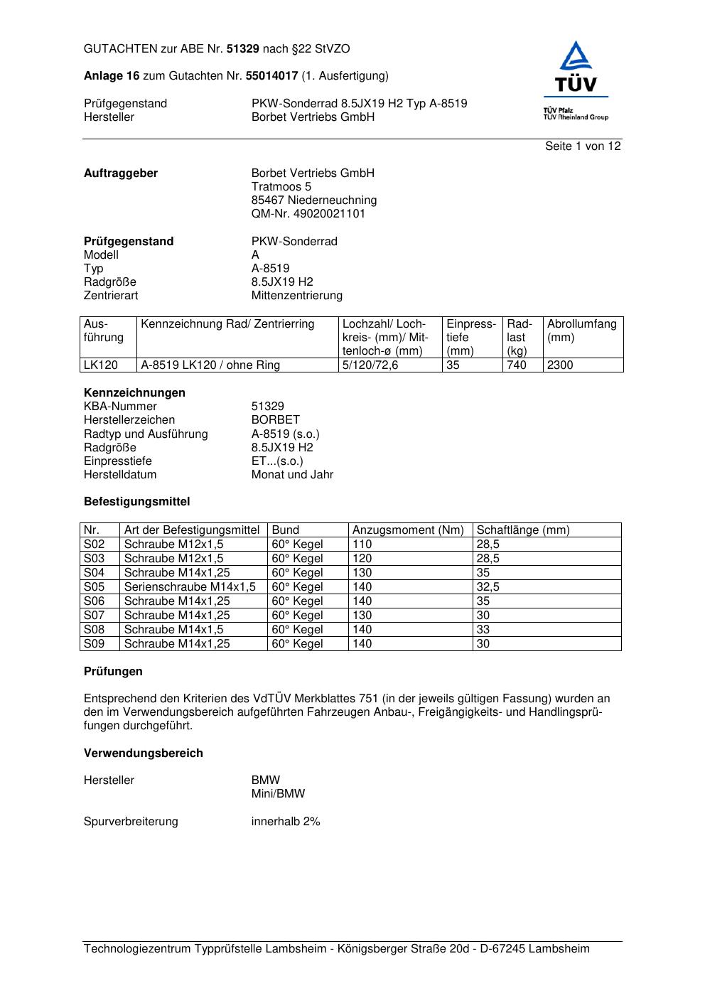 Felgengutachten / abe für Alufelgen Borbet A-8519 (8.5Jx19 ET 0, Mittenloch 0 mm) mit KBA 51329 (Zertifikatsnummer 51329). Hier kostenlos als PDF herunterladen. Der Download-Link ist 24 Stunden gültig und kann bis zu zwei Mal verwendet werden.