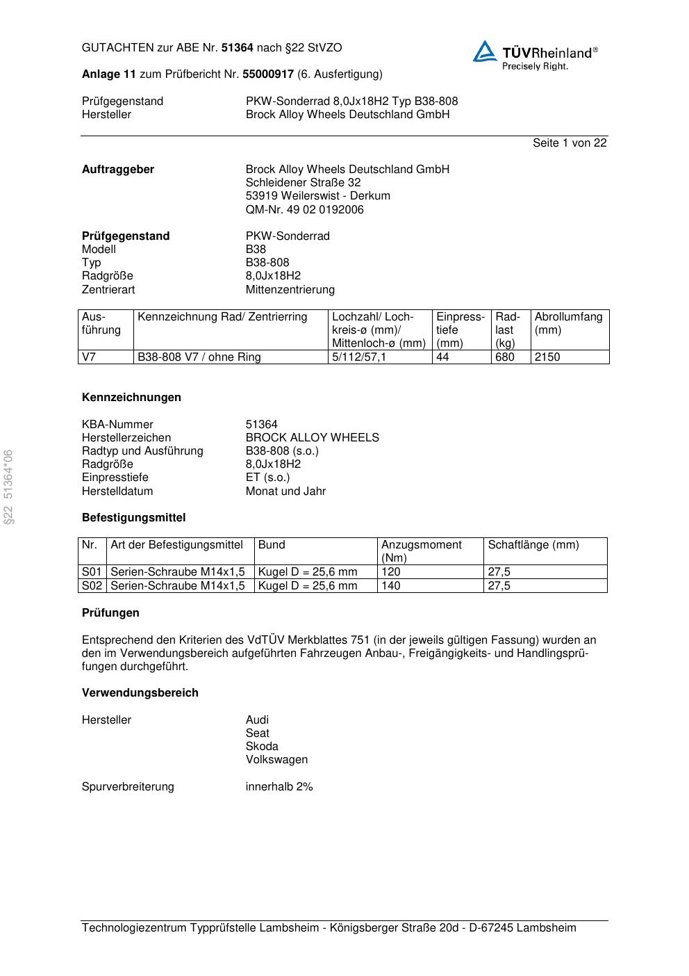 Dieses Gutachten (abe) bezieht sich auf die Alufelge Brock B38-808 in der Ausführung 8Jx18 ET 0, Mittenloch 0 mm (KBA 51364). Im PDF findest du typischerweise zulässige Reifengrößen, Auflagen/Anbauhinweise und – je nach Dokument – Hinweise zur Eintragung.