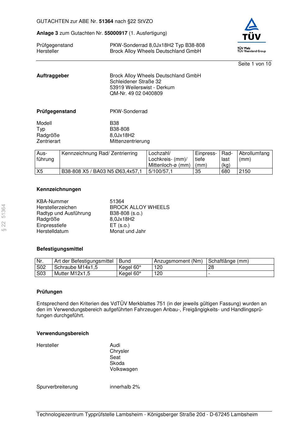 Dieses Gutachten (abe) bezieht sich auf die Alufelge Brock B38-808 in der Ausführung 8Jx18 ET 0, Mittenloch 0 mm (KBA 51364). Im PDF findest du typischerweise zulässige Reifengrößen, Auflagen/Anbauhinweise und – je nach Dokument – Hinweise zur Eintragung.