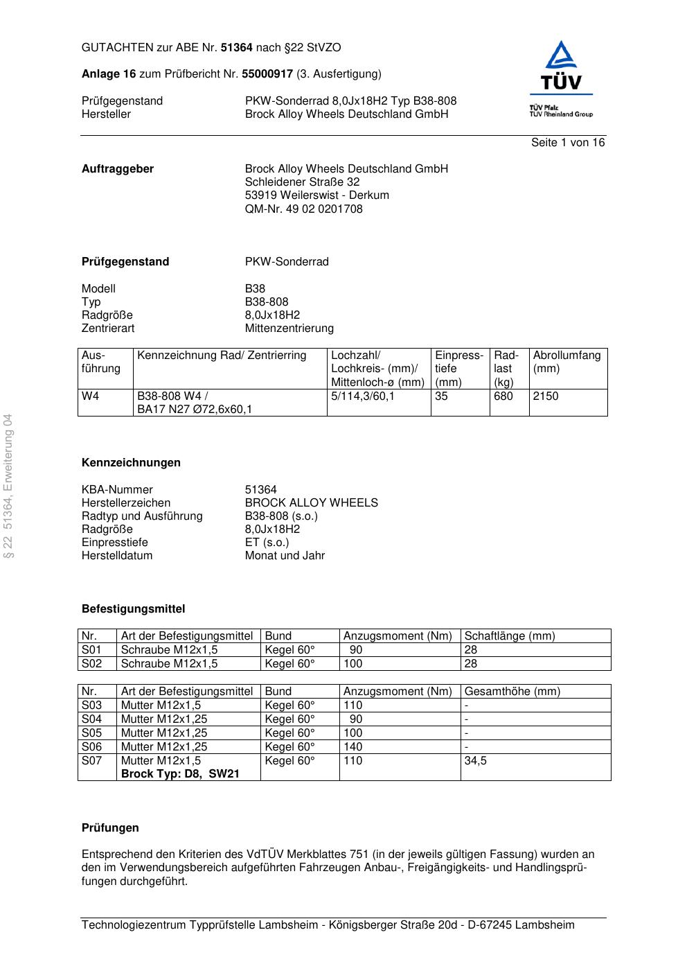 Dieses Gutachten (abe) bezieht sich auf die Alufelge Brock B38-808 in der Ausführung 8Jx18 ET 0, Mittenloch 0 mm (KBA 51364). Im PDF findest du typischerweise zulässige Reifengrößen, Auflagen/Anbauhinweise und – je nach Dokument – Hinweise zur Eintragung.