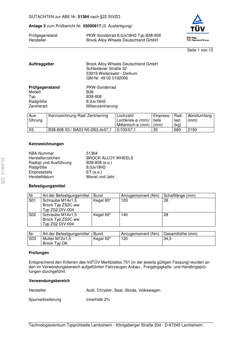 Dieses Gutachten (abe) bezieht sich auf die Alufelge Brock B38-808 in der Ausführung 8Jx18 ET 0, Mittenloch 0 mm (KBA 51364). Im PDF findest du typischerweise zulässige Reifengrößen, Auflagen/Anbauhinweise und – je nach Dokument – Hinweise zur Eintragung.