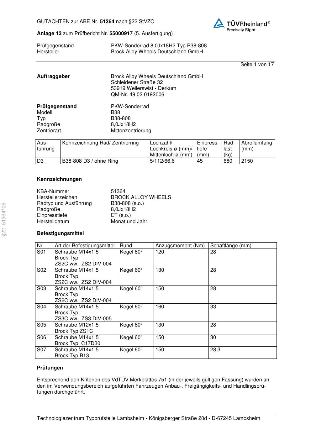 Dieses Gutachten (abe) bezieht sich auf die Alufelge Brock B38-808 in der Ausführung 8Jx18 ET 0, Mittenloch 0 mm (KBA 51364). Im PDF findest du typischerweise zulässige Reifengrößen, Auflagen/Anbauhinweise und – je nach Dokument – Hinweise zur Eintragung.