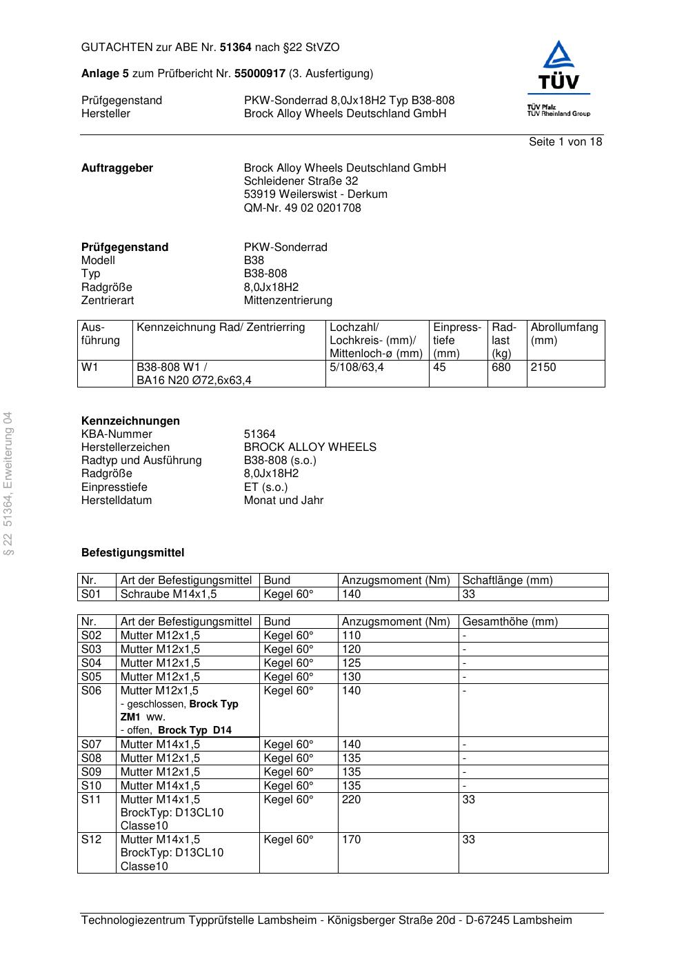 Dieses Gutachten (abe) bezieht sich auf die Alufelge Brock B38-808 in der Ausführung 8Jx18 ET 0, Mittenloch 0 mm (KBA 51364). Im PDF findest du typischerweise zulässige Reifengrößen, Auflagen/Anbauhinweise und – je nach Dokument – Hinweise zur Eintragung.