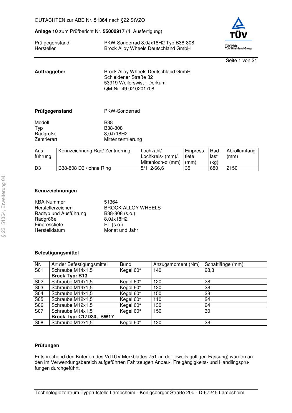 Dieses Gutachten (abe) bezieht sich auf die Alufelge Brock B38-808 in der Ausführung 8Jx18 ET 0, Mittenloch 0 mm (KBA 51364). Im PDF findest du typischerweise zulässige Reifengrößen, Auflagen/Anbauhinweise und – je nach Dokument – Hinweise zur Eintragung.